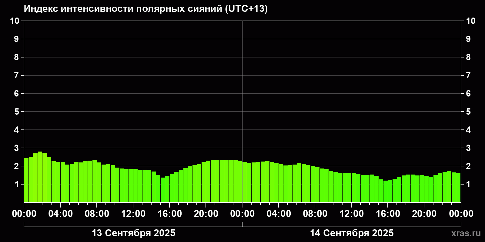 Изменения индекса интенсивности полярных сияний с 2025-09-13 по 2025-09-14 по местному времени