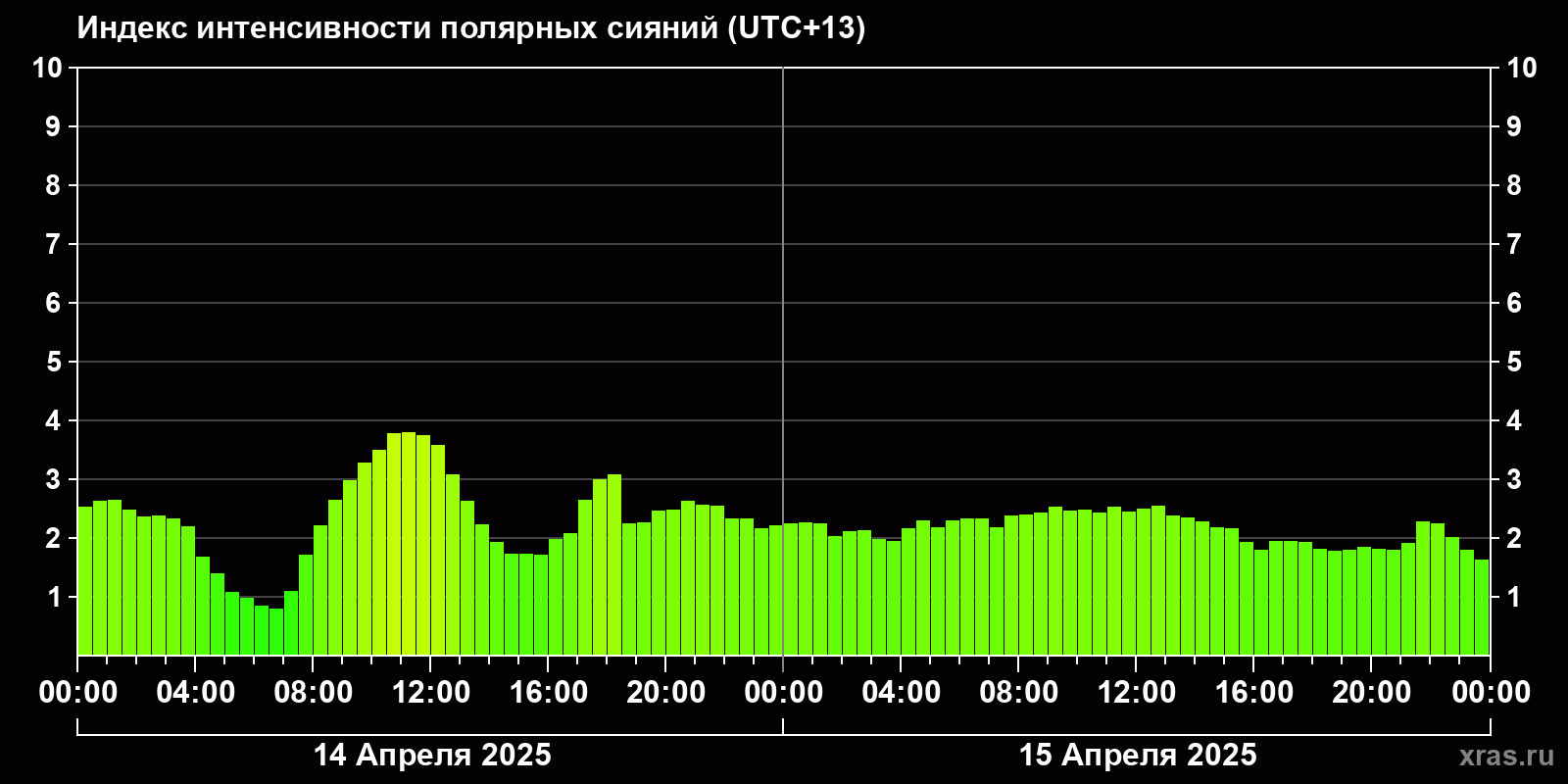 Изменения индекса интенсивности полярных сияний с 2025-04-14 по 2025-04-15 по местному времени