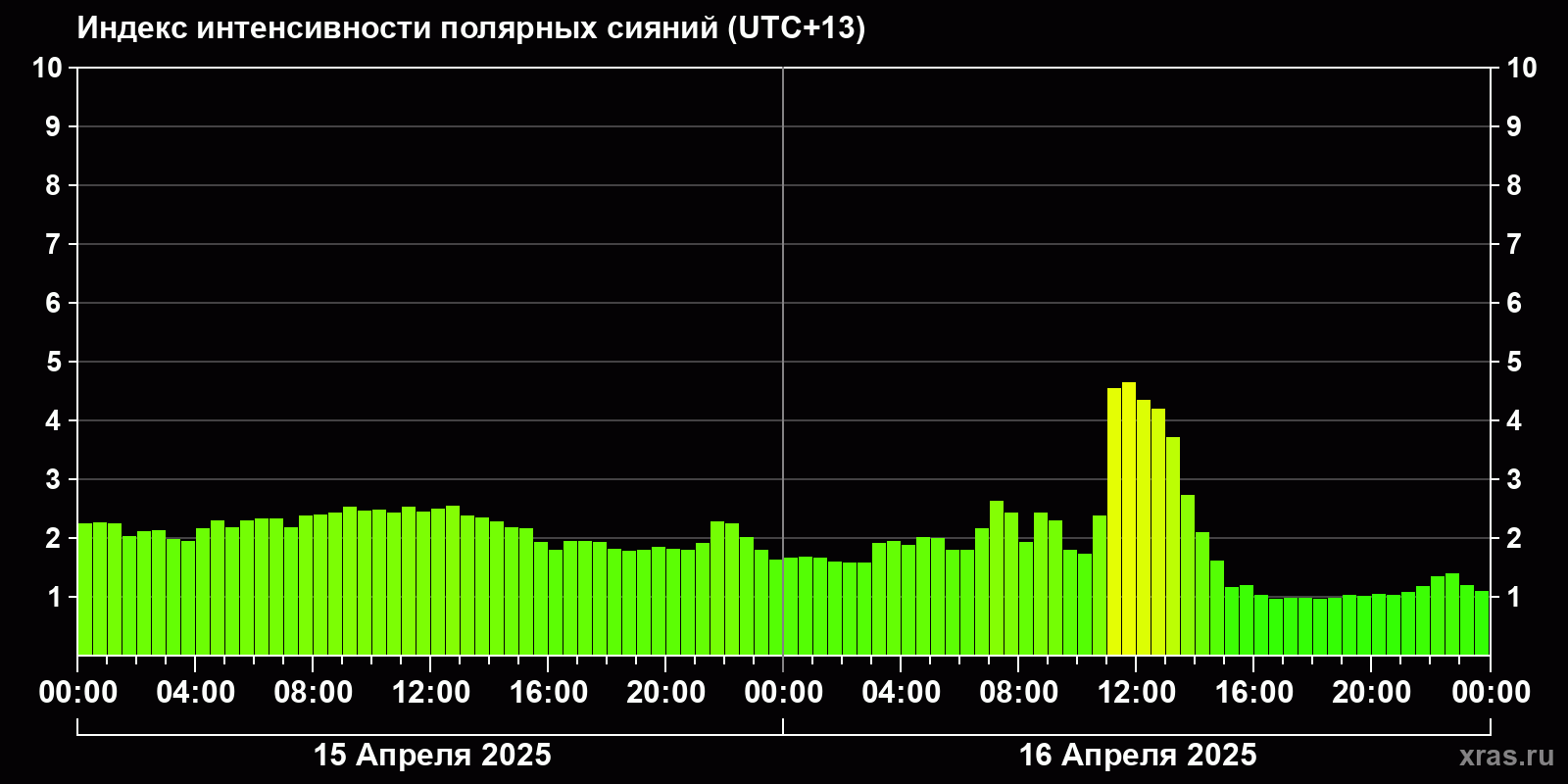 Изменения индекса интенсивности полярных сияний с 2025-04-15 по 2025-04-16 по местному времени