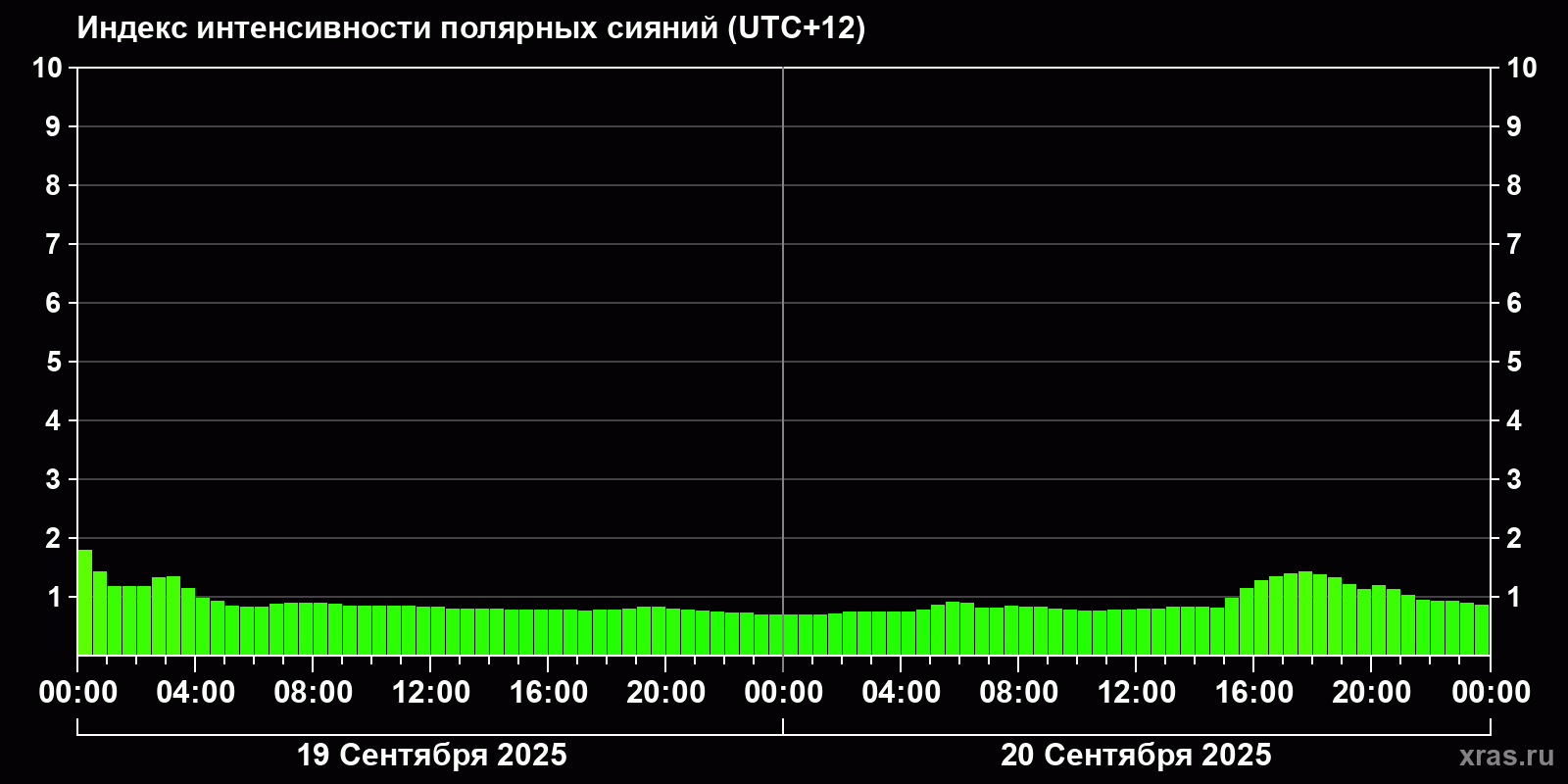 Изменения индекса интенсивности полярных сияний с 2025-09-20 по 2025-09-21 по местному времени