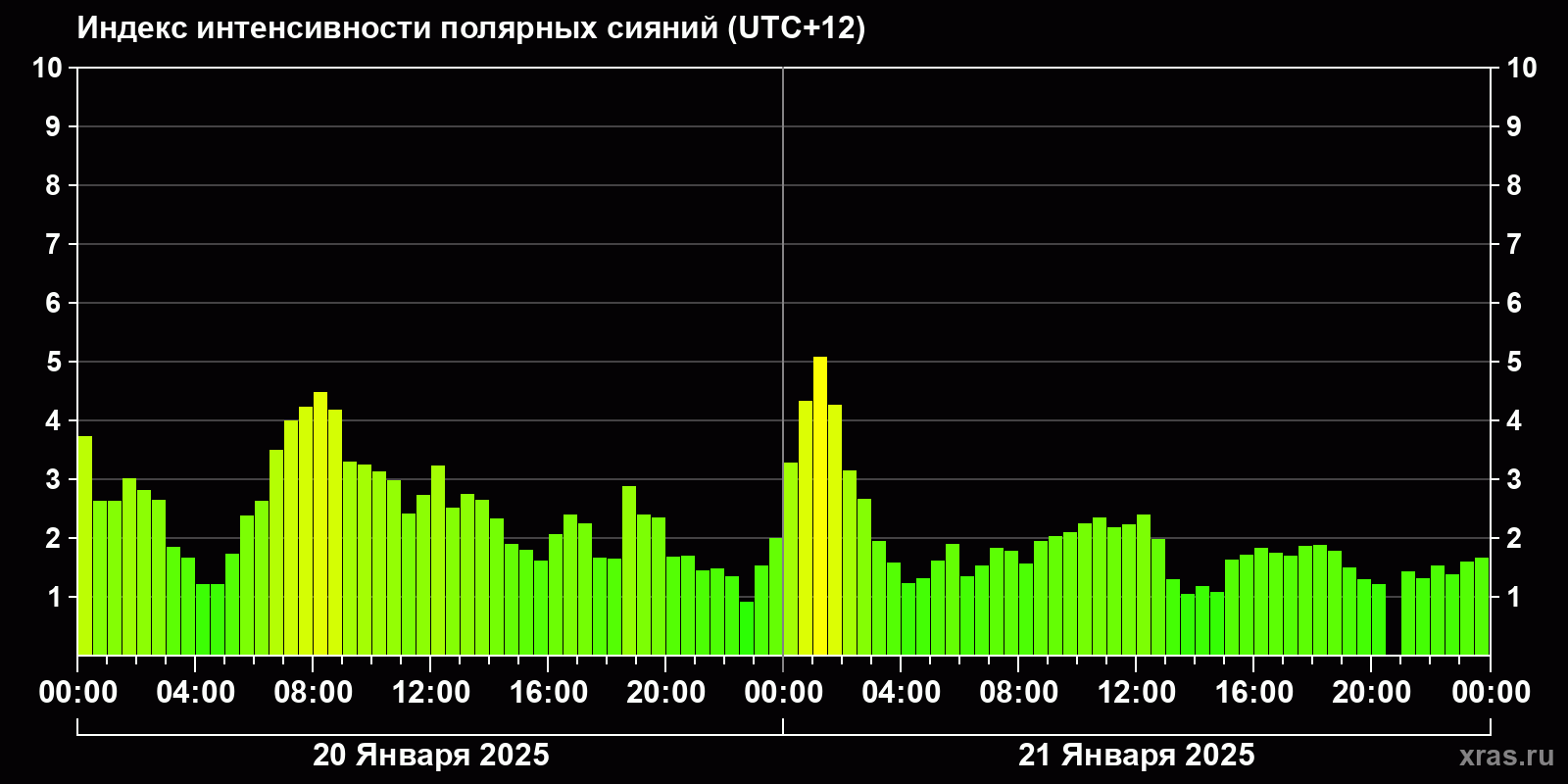 Изменения индекса интенсивности полярных сияний с 2025-01-20 по 2025-01-21 по местному времени