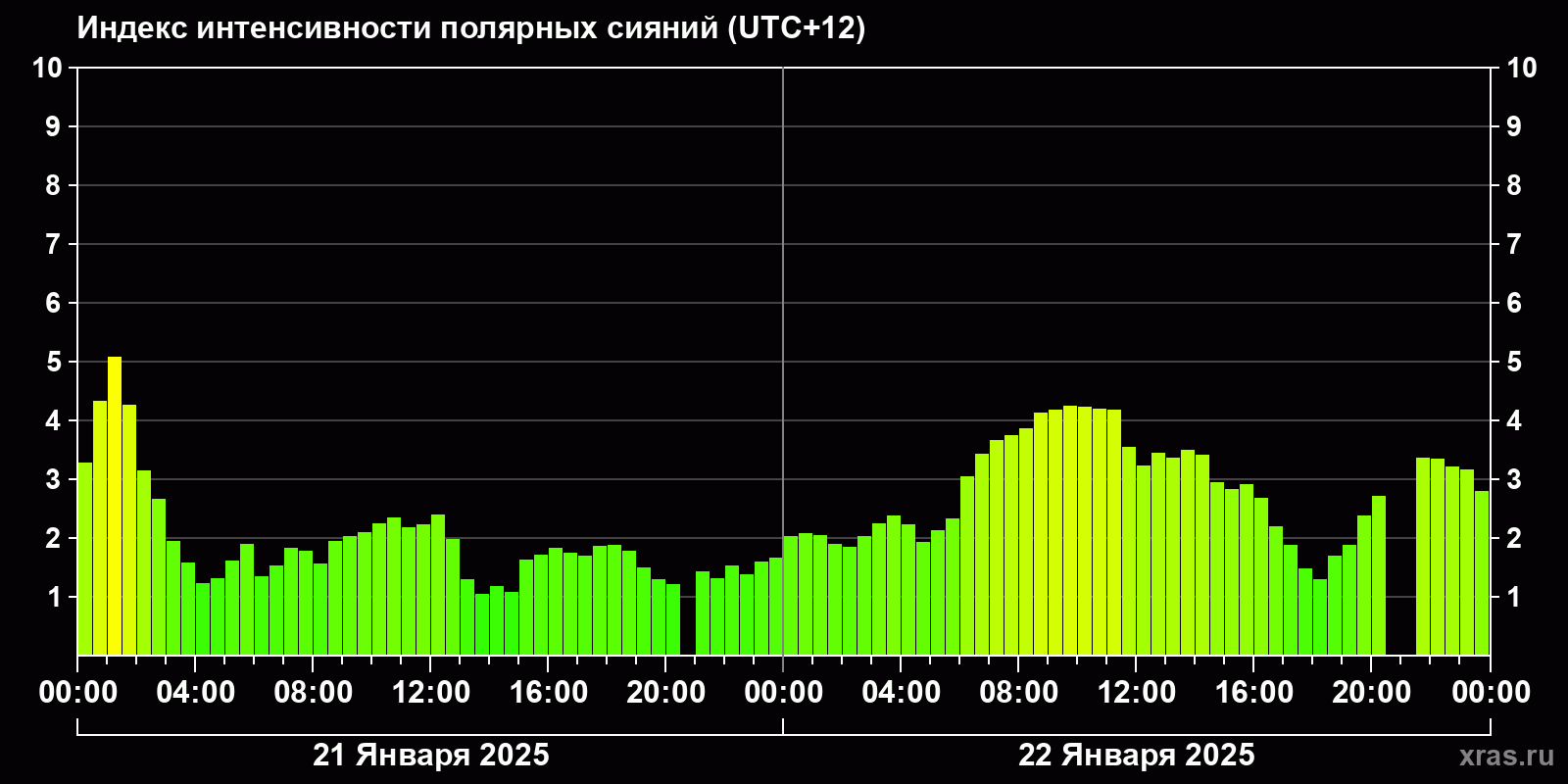 Изменения индекса интенсивности полярных сияний с 2025-01-21 по 2025-01-22 по местному времени