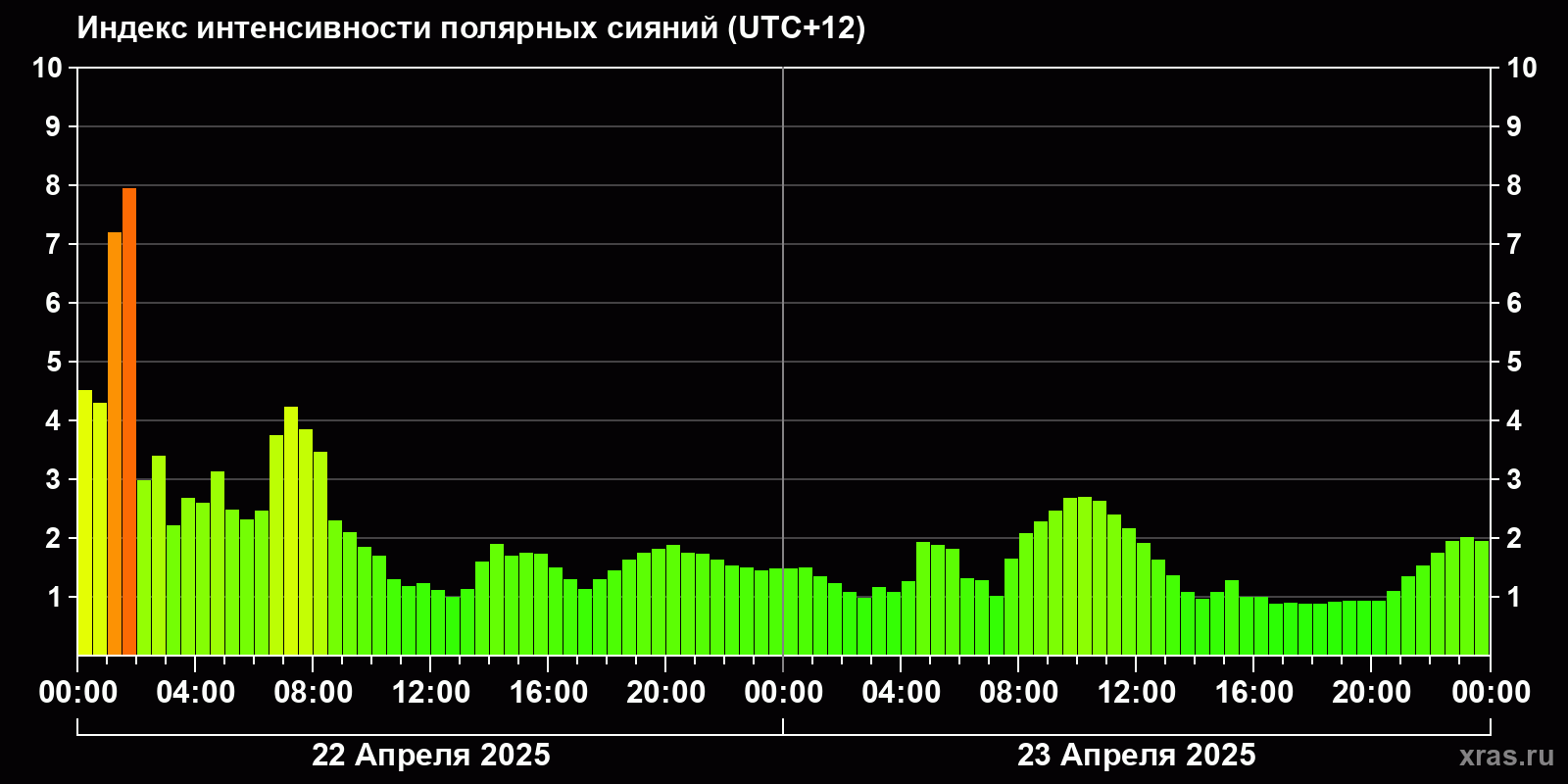 Изменения индекса интенсивности полярных сияний с 2025-04-23 по 2025-04-24 по местному времени