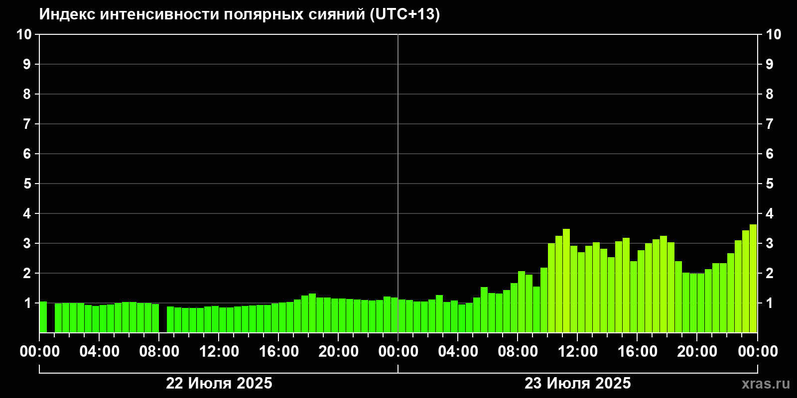 Изменения индекса интенсивности полярных сияний с 2025-07-22 по 2025-07-23 по местному времени