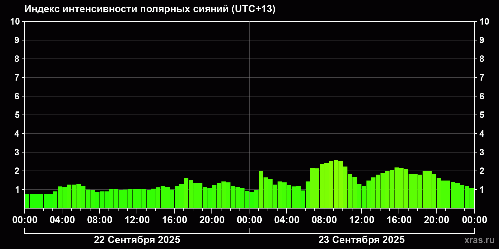 Изменения индекса интенсивности полярных сияний с 2025-09-22 по 2025-09-23 по местному времени