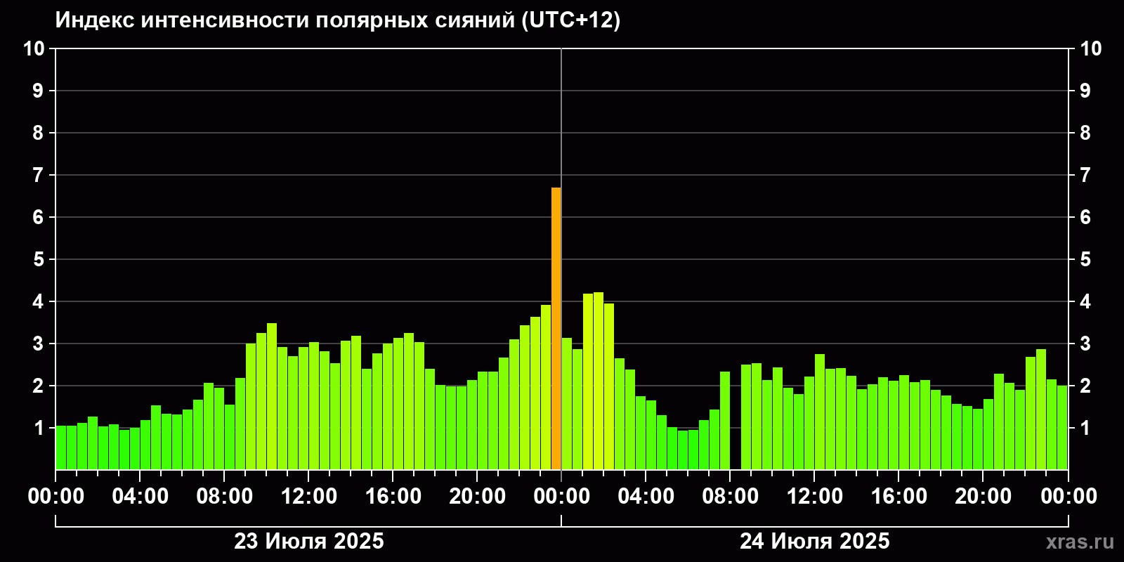 Изменения индекса интенсивности полярных сияний с 2025-07-24 по 2025-07-25 по местному времени