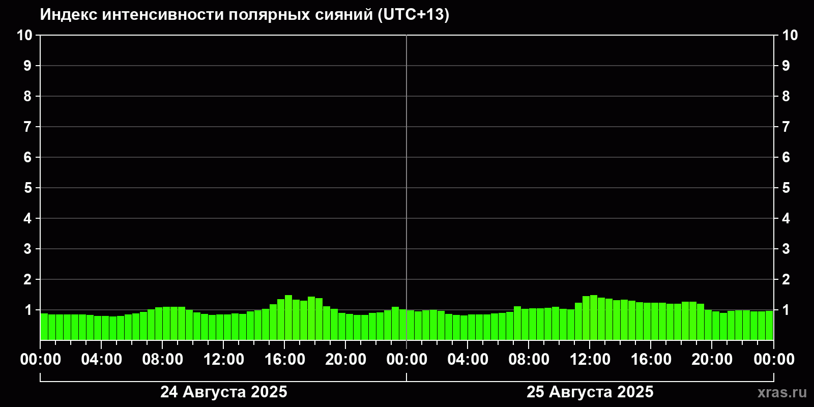 Изменения индекса интенсивности полярных сияний с 2025-08-24 по 2025-08-25 по местному времени