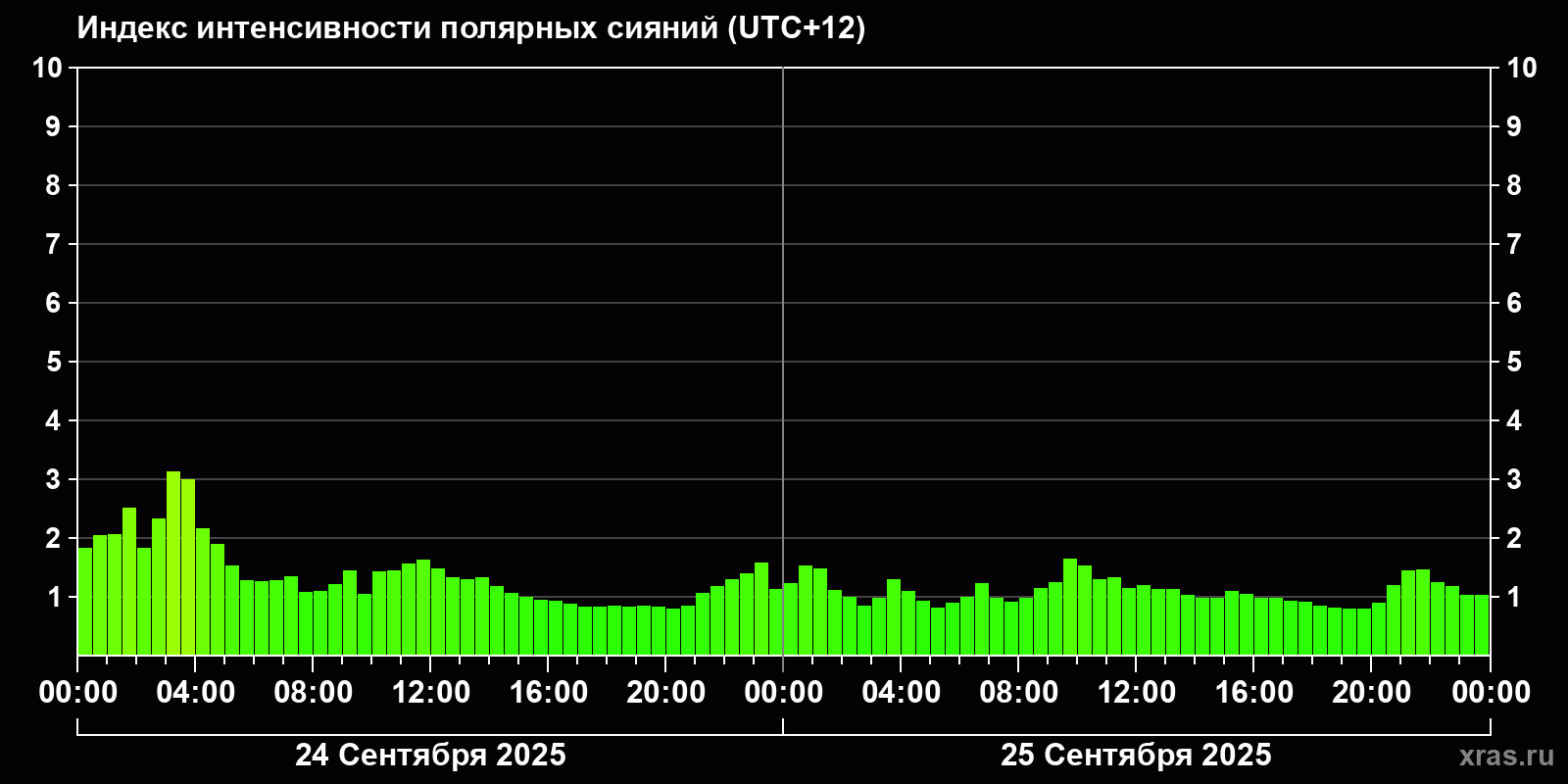 Изменения индекса интенсивности полярных сияний с 2025-09-25 по 2025-09-26 по местному времени