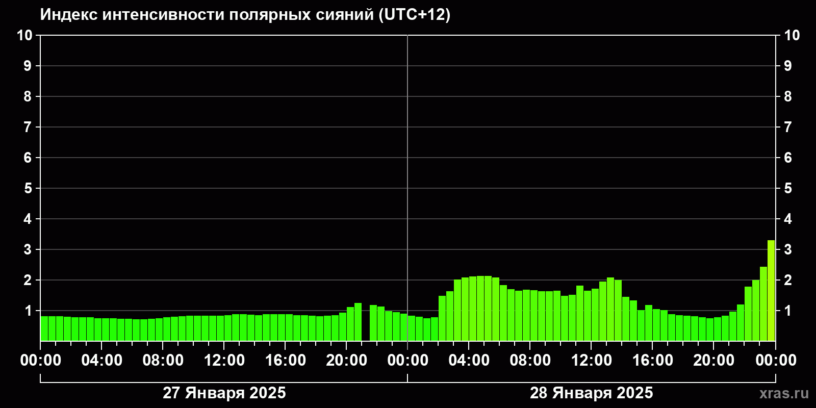 Изменения индекса интенсивности полярных сияний с 2025-01-27 по 2025-01-28 по местному времени