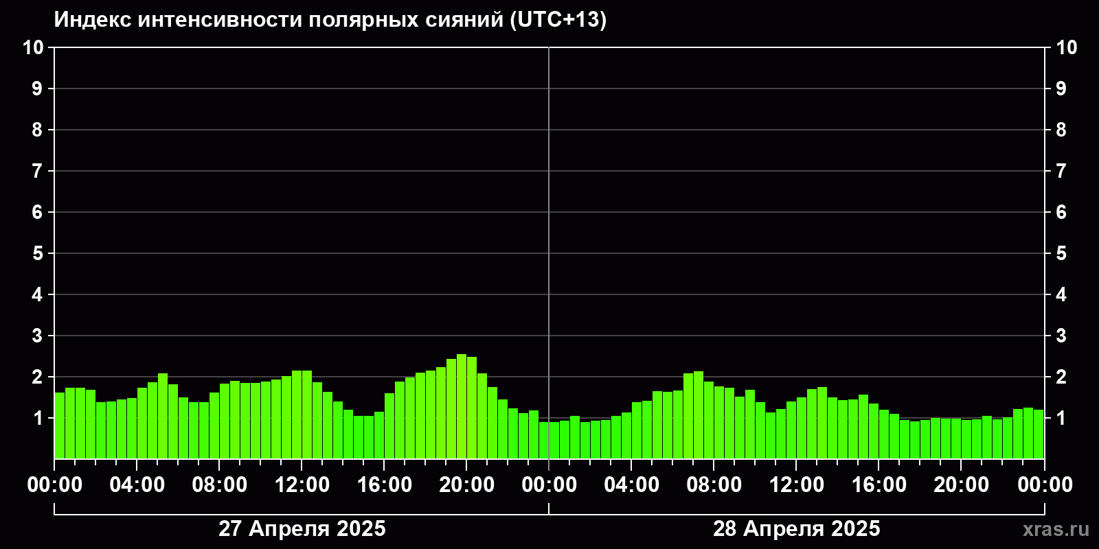 Изменения индекса интенсивности полярных сияний с 2025-04-27 по 2025-04-28 по местному времени