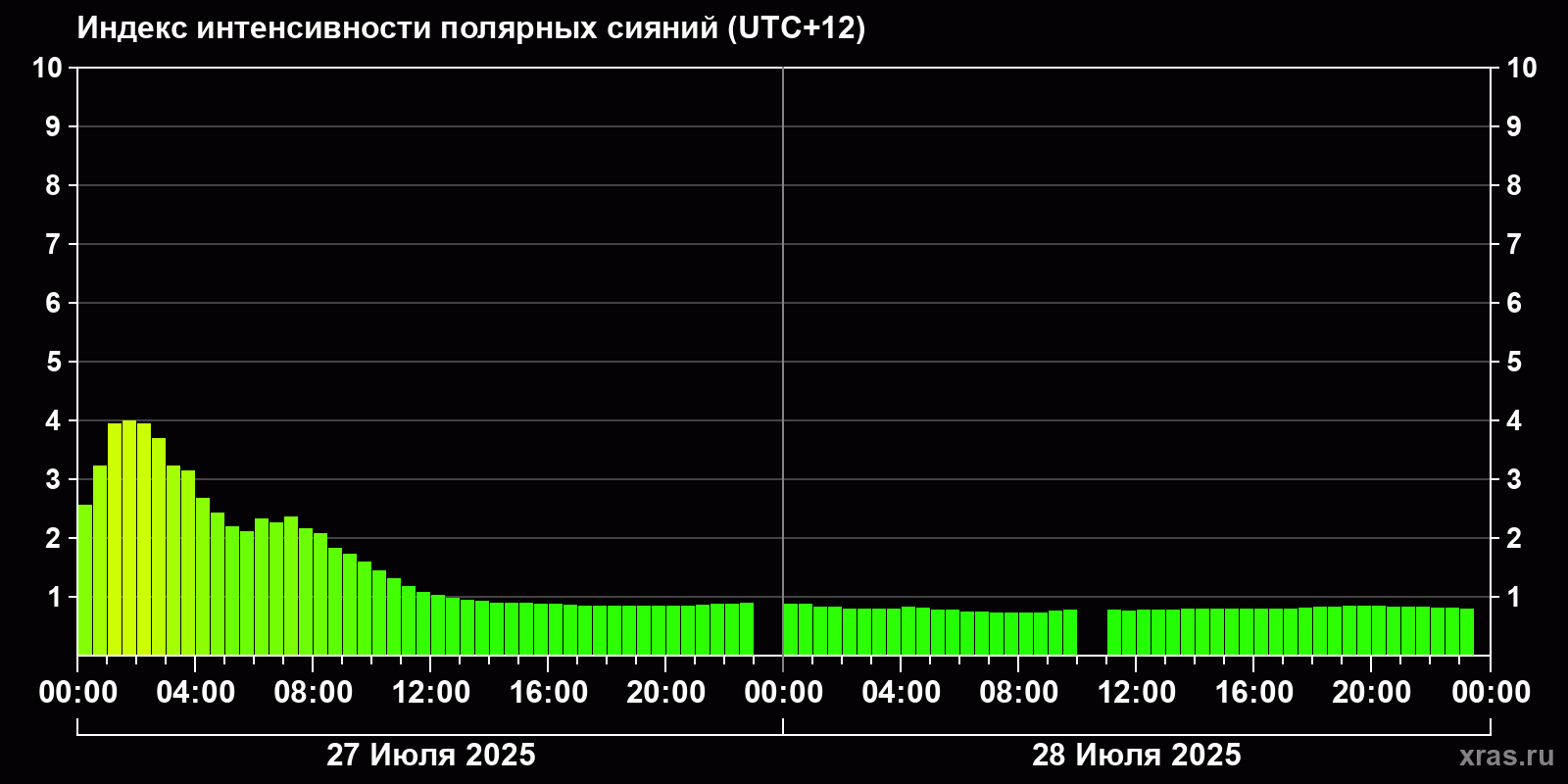 Изменения индекса интенсивности полярных сияний с 2025-07-28 по 2025-07-29 по местному времени