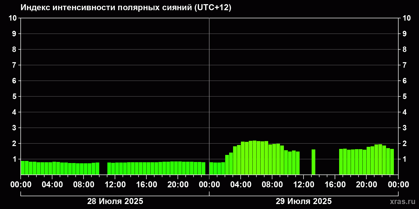 Изменения индекса интенсивности полярных сияний с 2025-07-29 по 2025-07-30 по местному времени