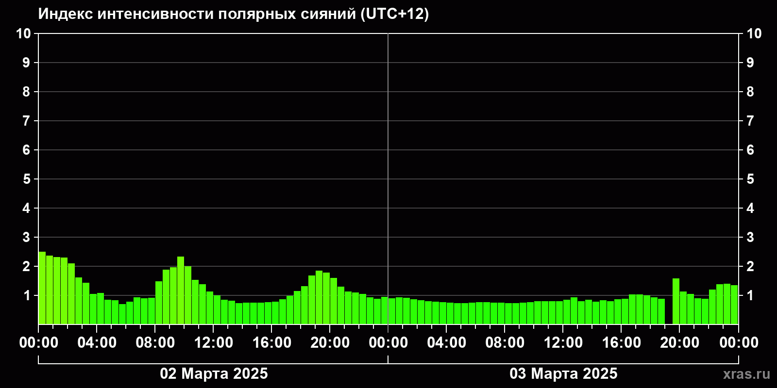 Изменения индекса интенсивности полярных сияний с 2025-03-02 по 2025-03-03 по местному времени