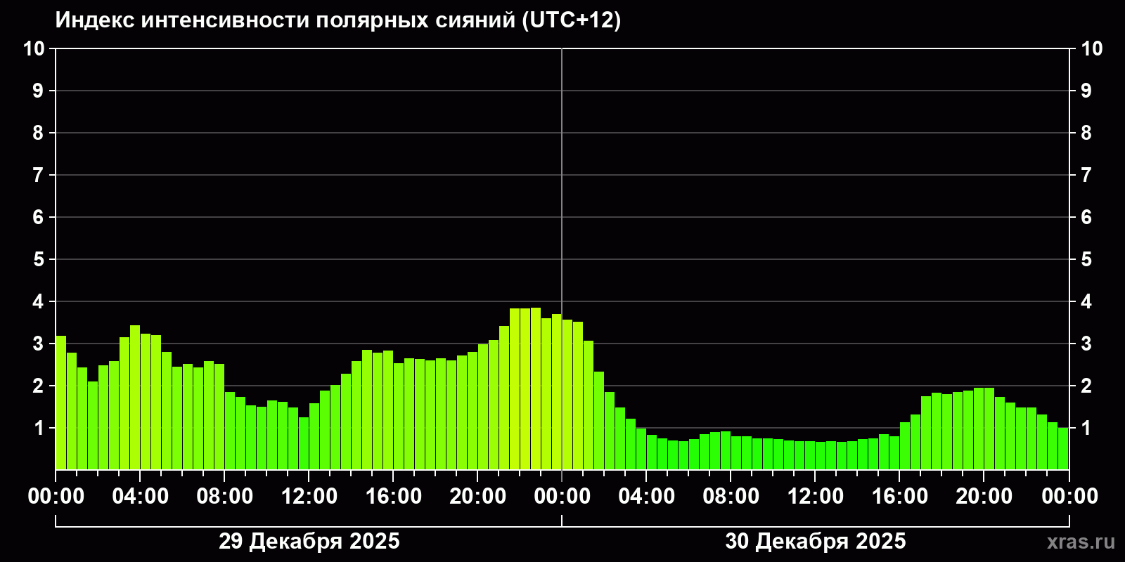 Изменения индекса интенсивности полярных сияний с 2025-12-29 по 2025-12-30 по местному времени