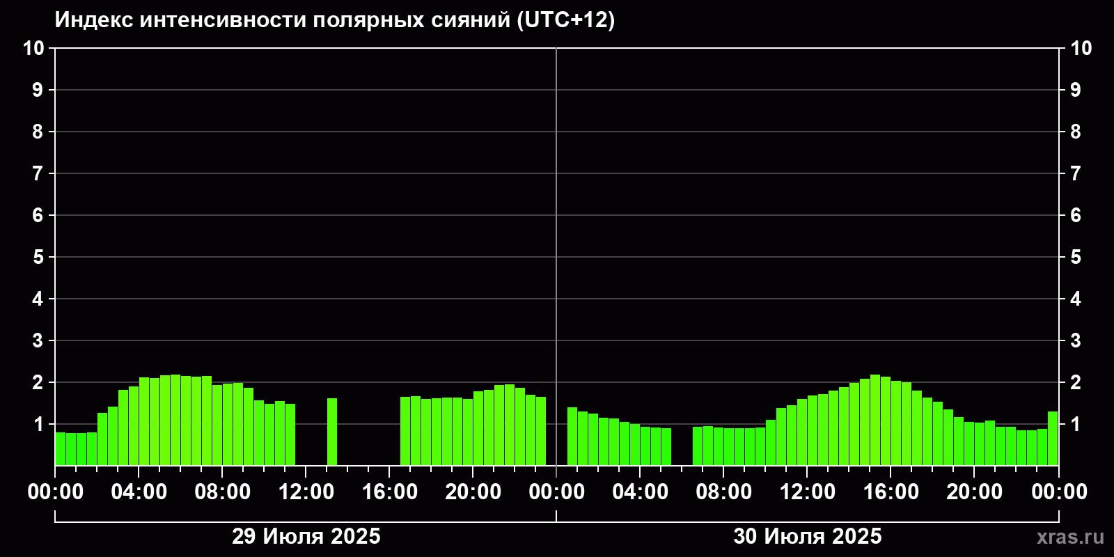 Изменения индекса интенсивности полярных сияний с 2025-07-29 по 2025-07-30 по местному времени