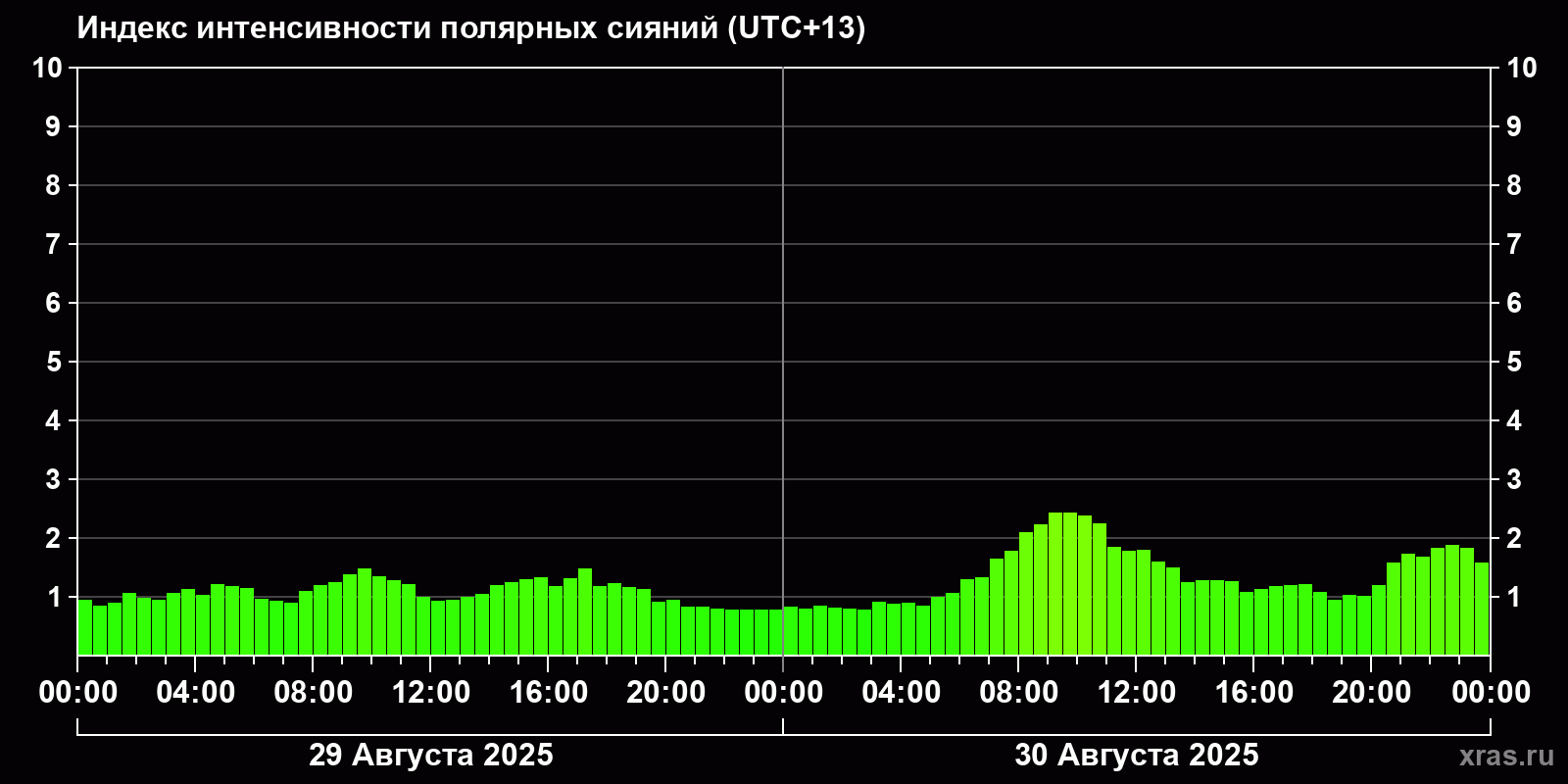 Изменения индекса интенсивности полярных сияний с 2025-08-29 по 2025-08-30 по местному времени