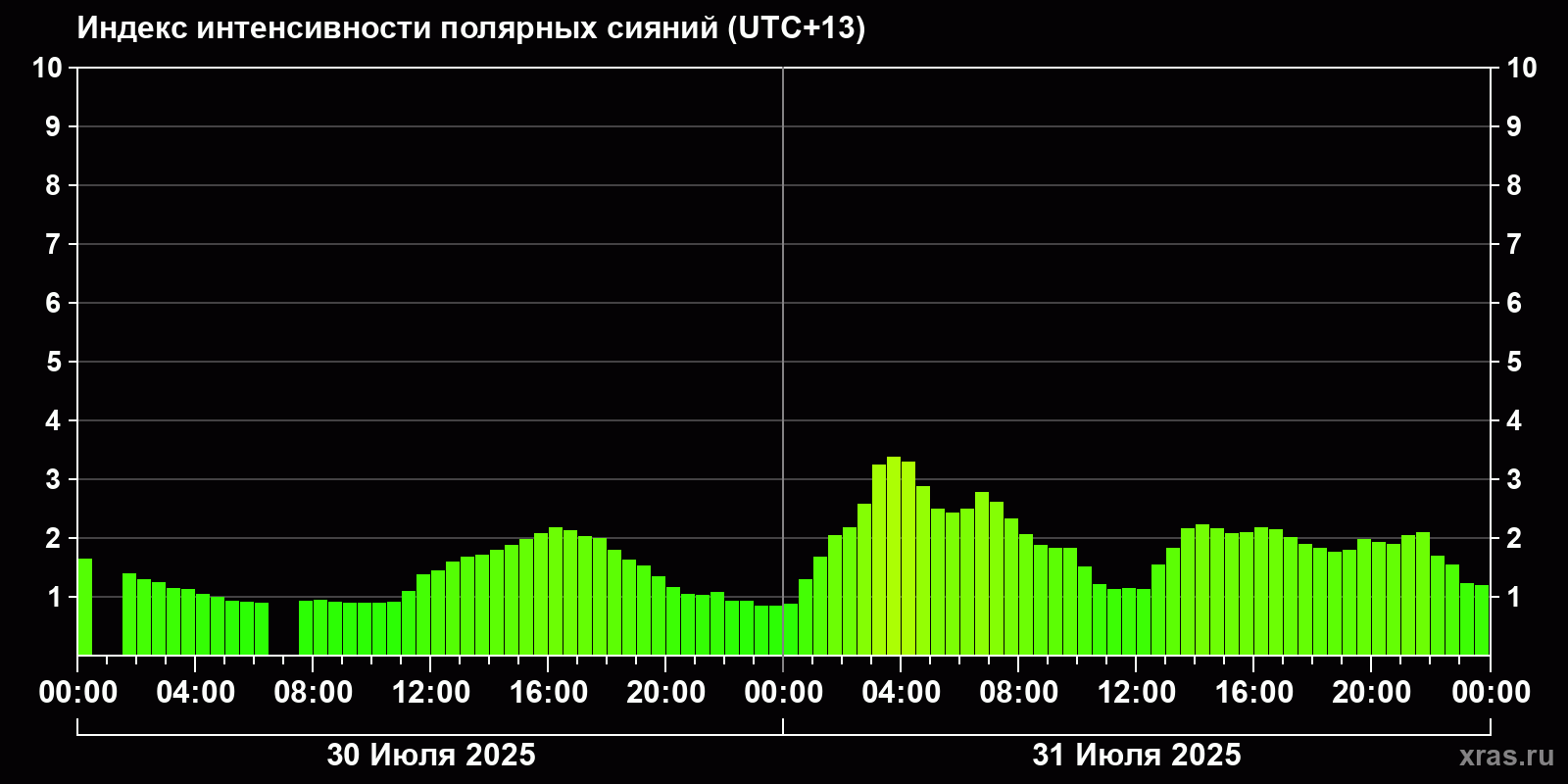 Изменения индекса интенсивности полярных сияний с 2025-07-30 по 2025-07-31 по местному времени
