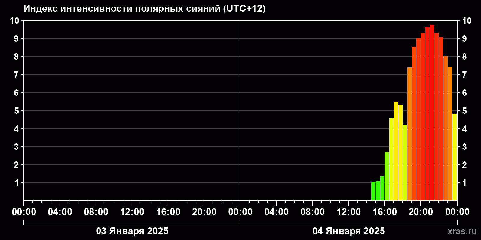 Изменения индекса интенсивности полярных сияний с 2025-01-03 по 2025-01-04 по местному времени