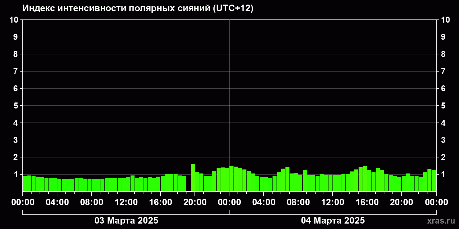 Изменения индекса интенсивности полярных сияний с 2025-03-03 по 2025-03-04 по местному времени