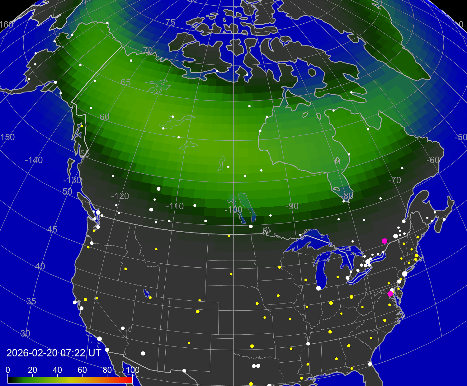 Изменения и часовой прогноз индекса интенсивности полярных сияний с 2026-02-18 по 2026-02-19