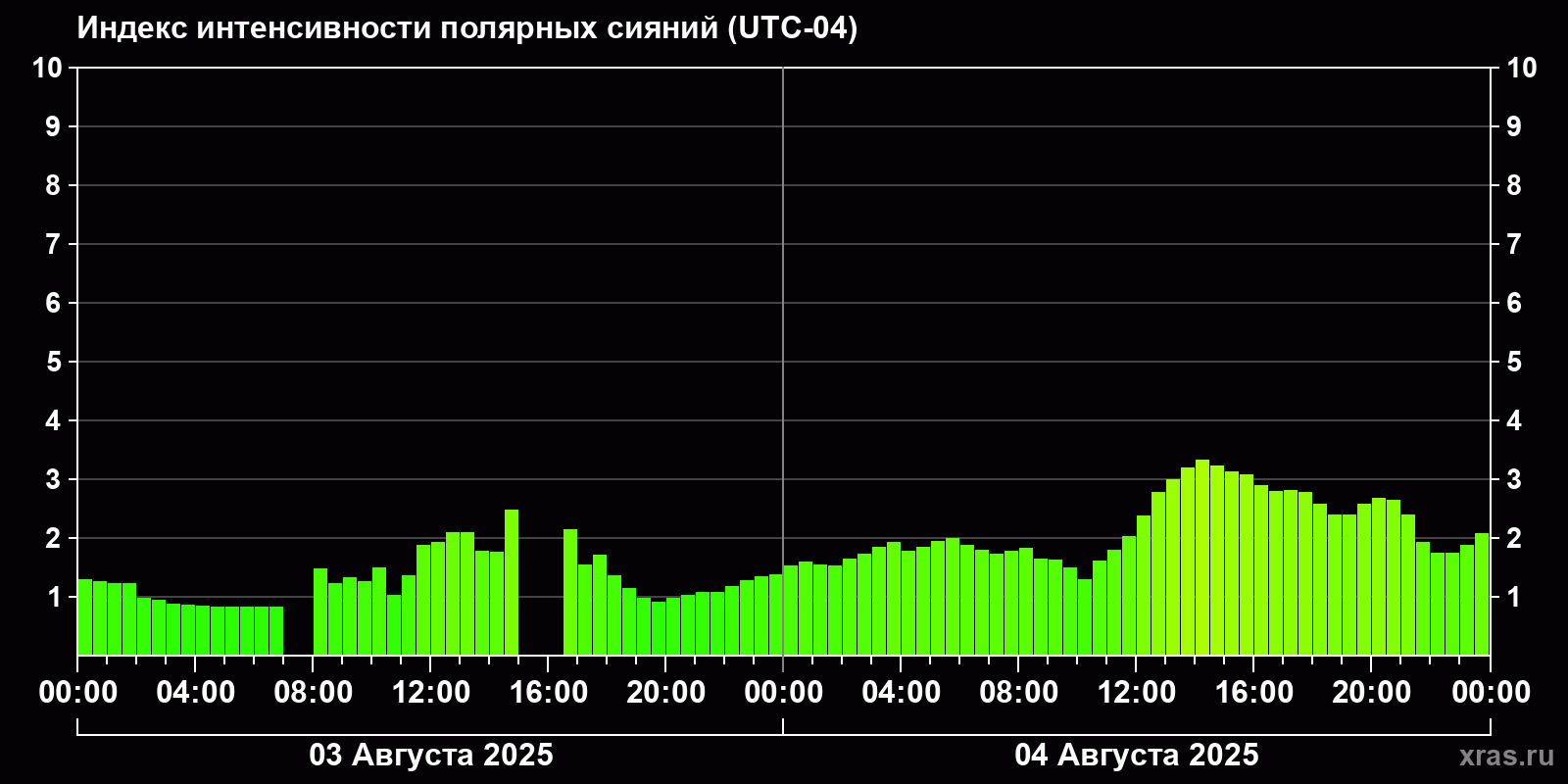 Изменения индекса интенсивности полярных сияний с 2025-08-03 по 2025-08-04 по местному времени