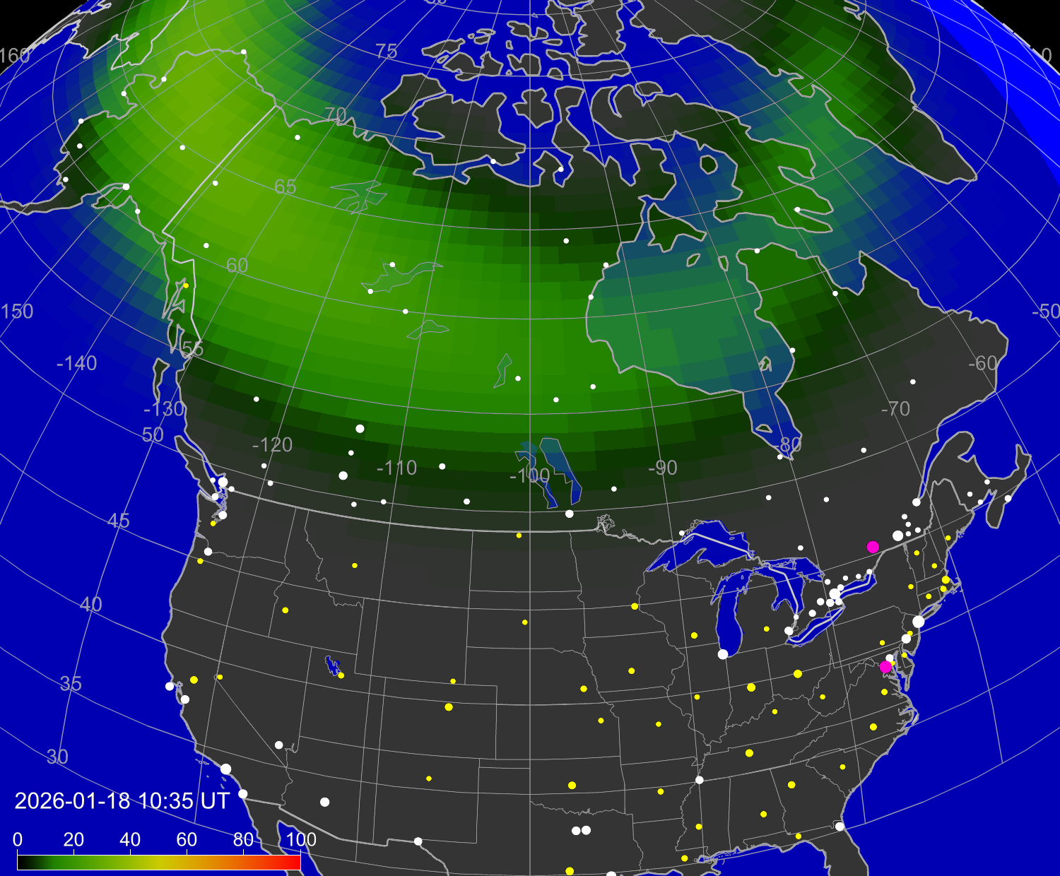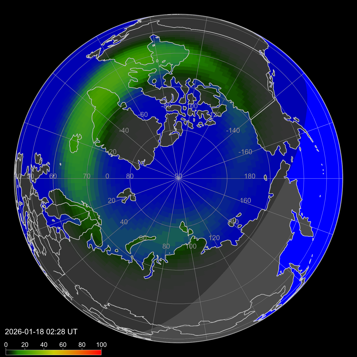 Индекс интенсивности полярных сияний и теоретически возможная широта наблюдений для ночного времени в западном полушарии