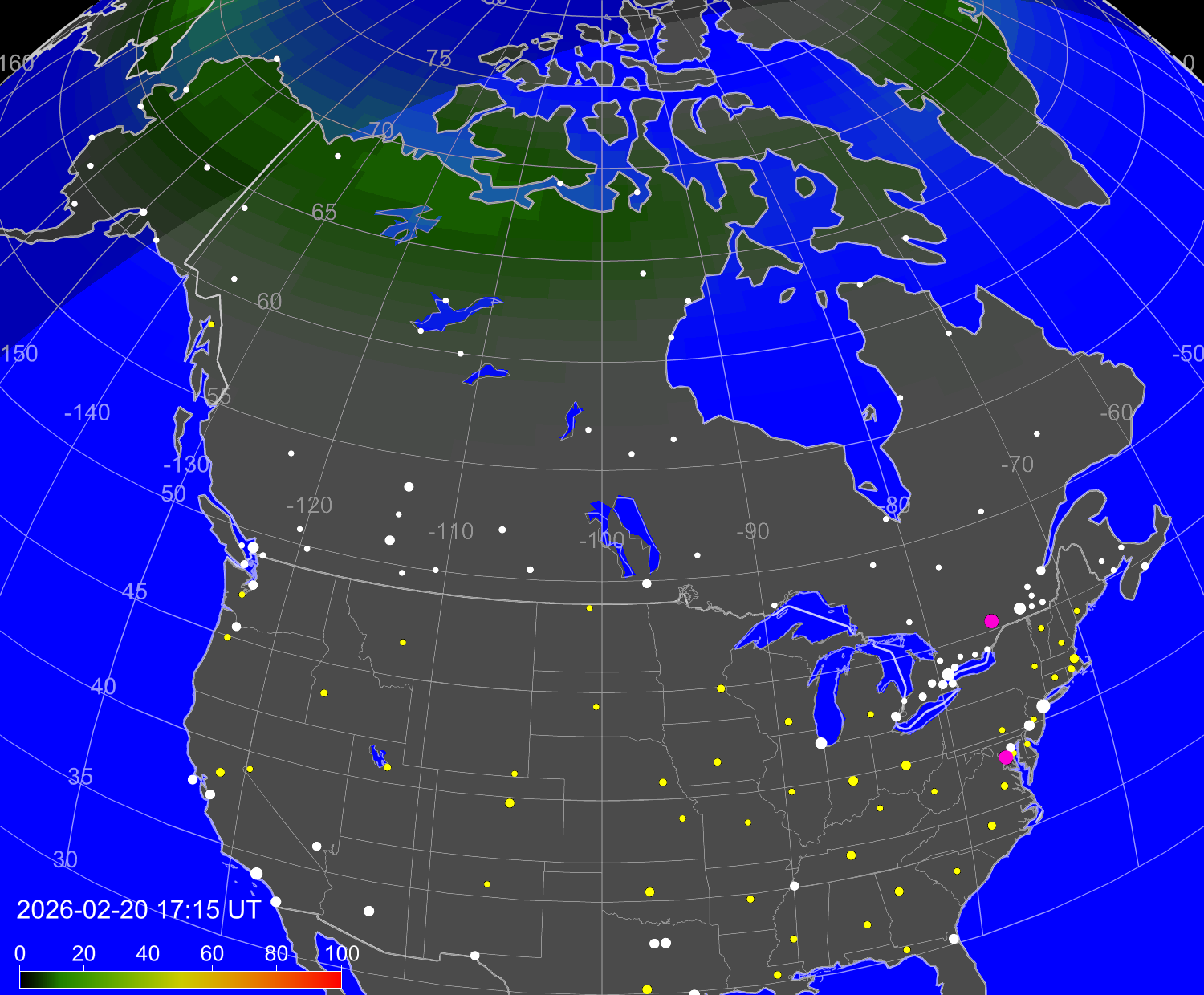 Зона полярных (северных) сияний над территорией Северной Америки