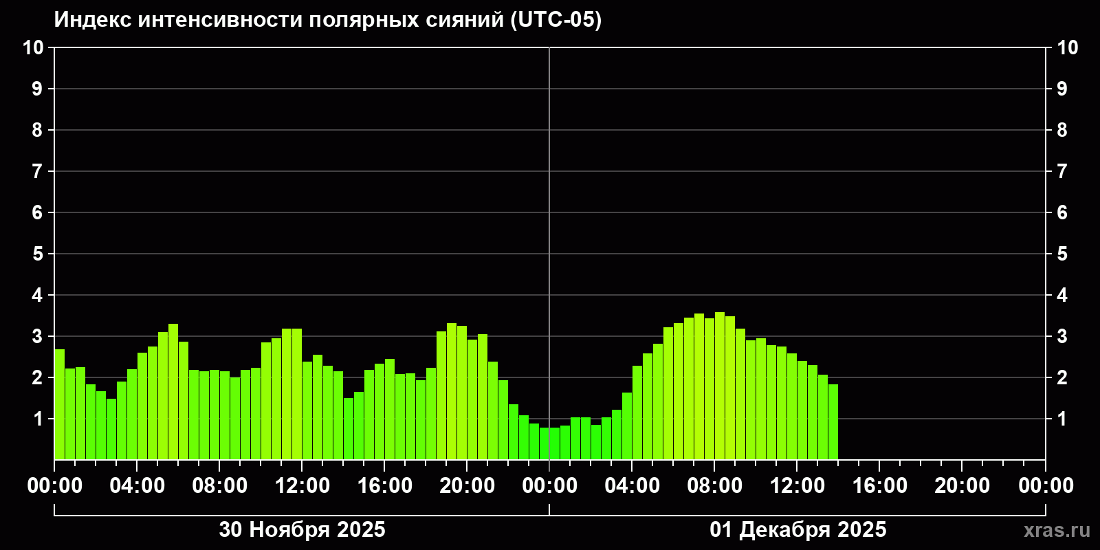 Изменения индекса интенсивности полярных сияний с 2025-11-30 по 2025-12-01 по местному времени