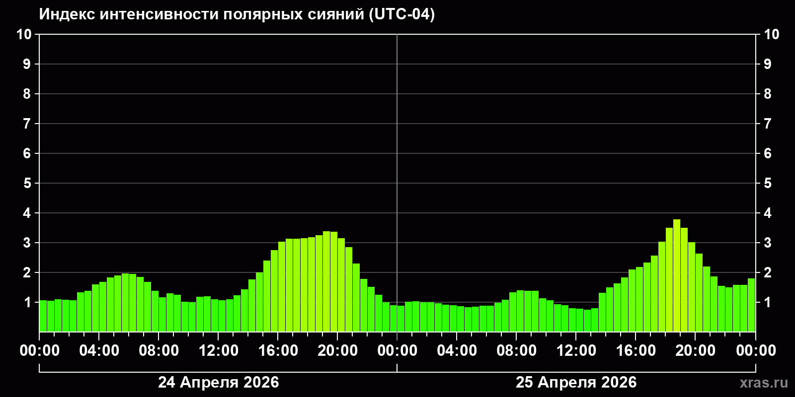 Изменения индекса интенсивности полярных сияний с 2026-04-24 по 2026-04-25 по местному времени