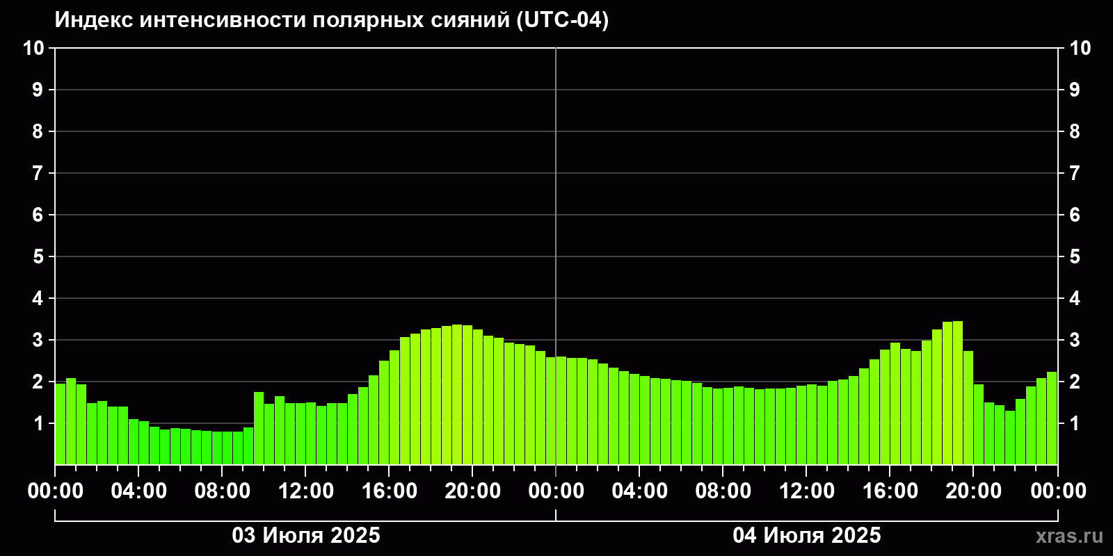 Изменения индекса интенсивности полярных сияний с 2025-07-03 по 2025-07-04 по местному времени