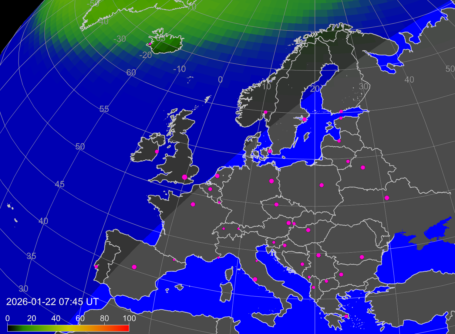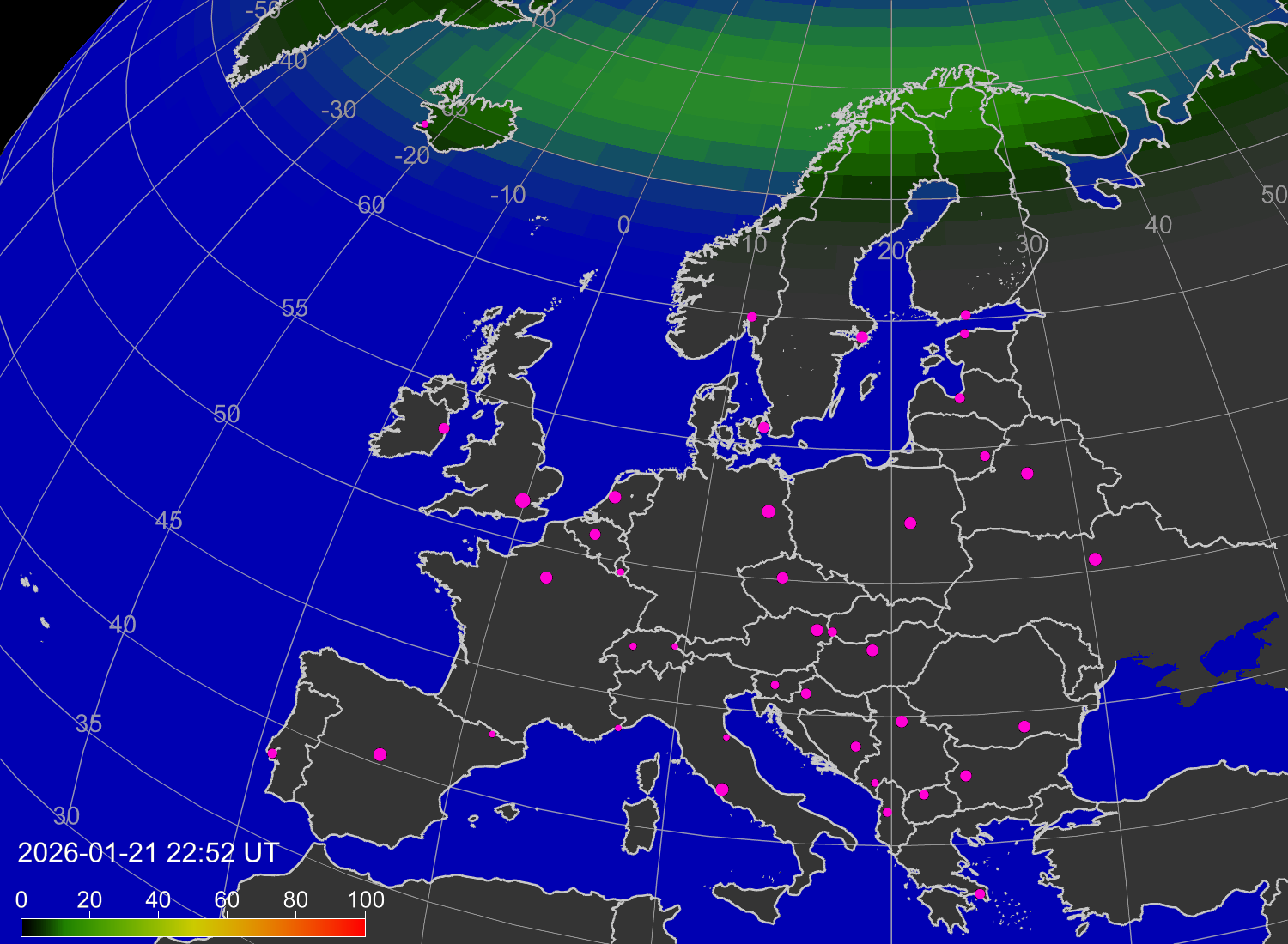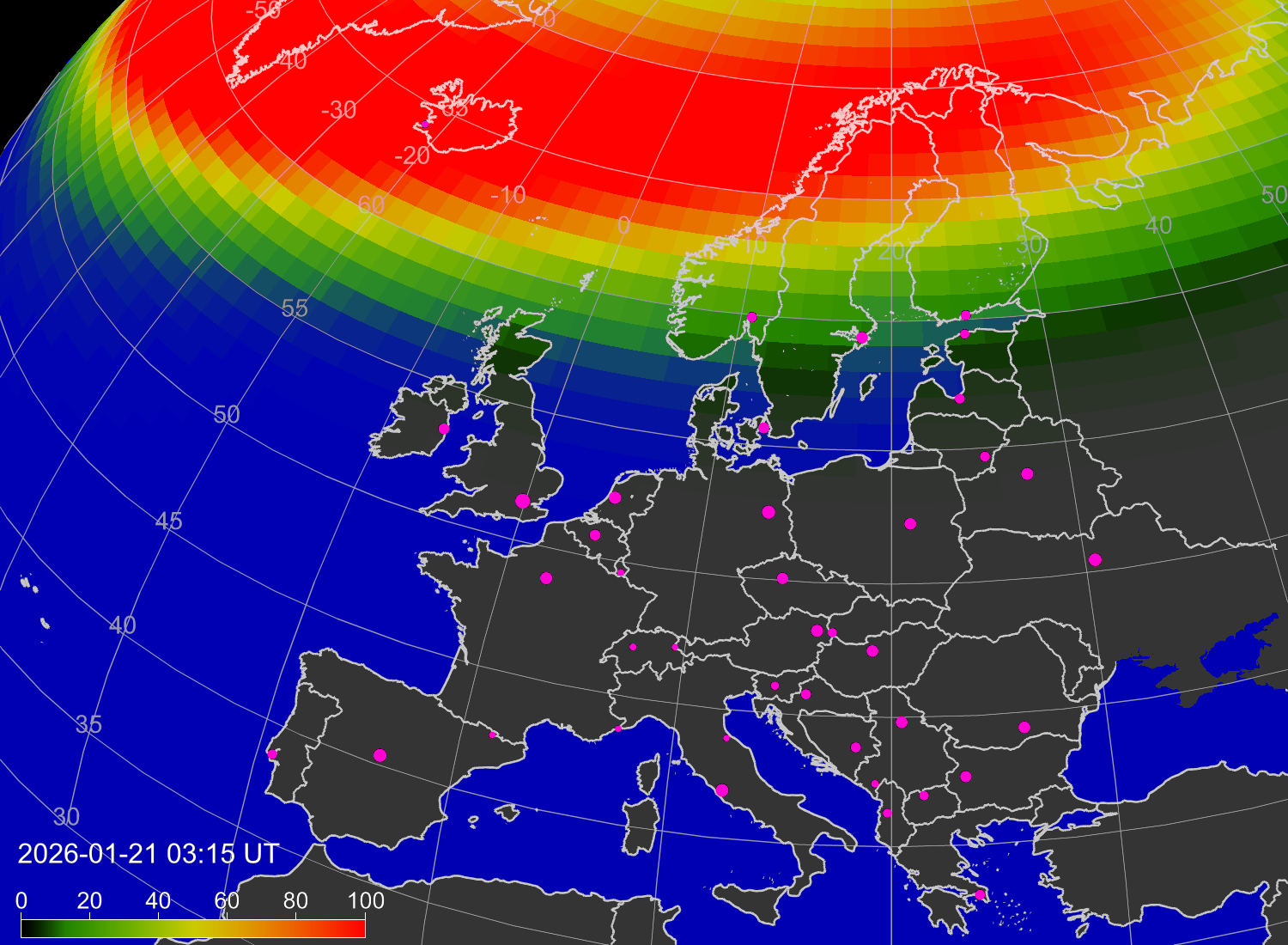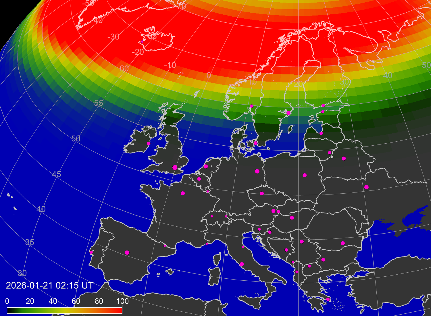 Вероятность полярных сияний в городах Европы