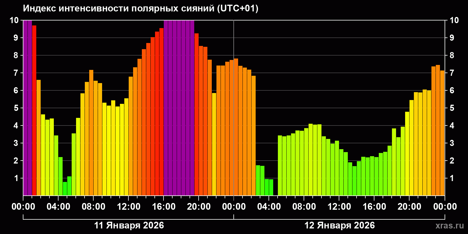 Изменения индекса интенсивности полярных сияний с 2026-01-11 по 2026-01-12 по местному времени