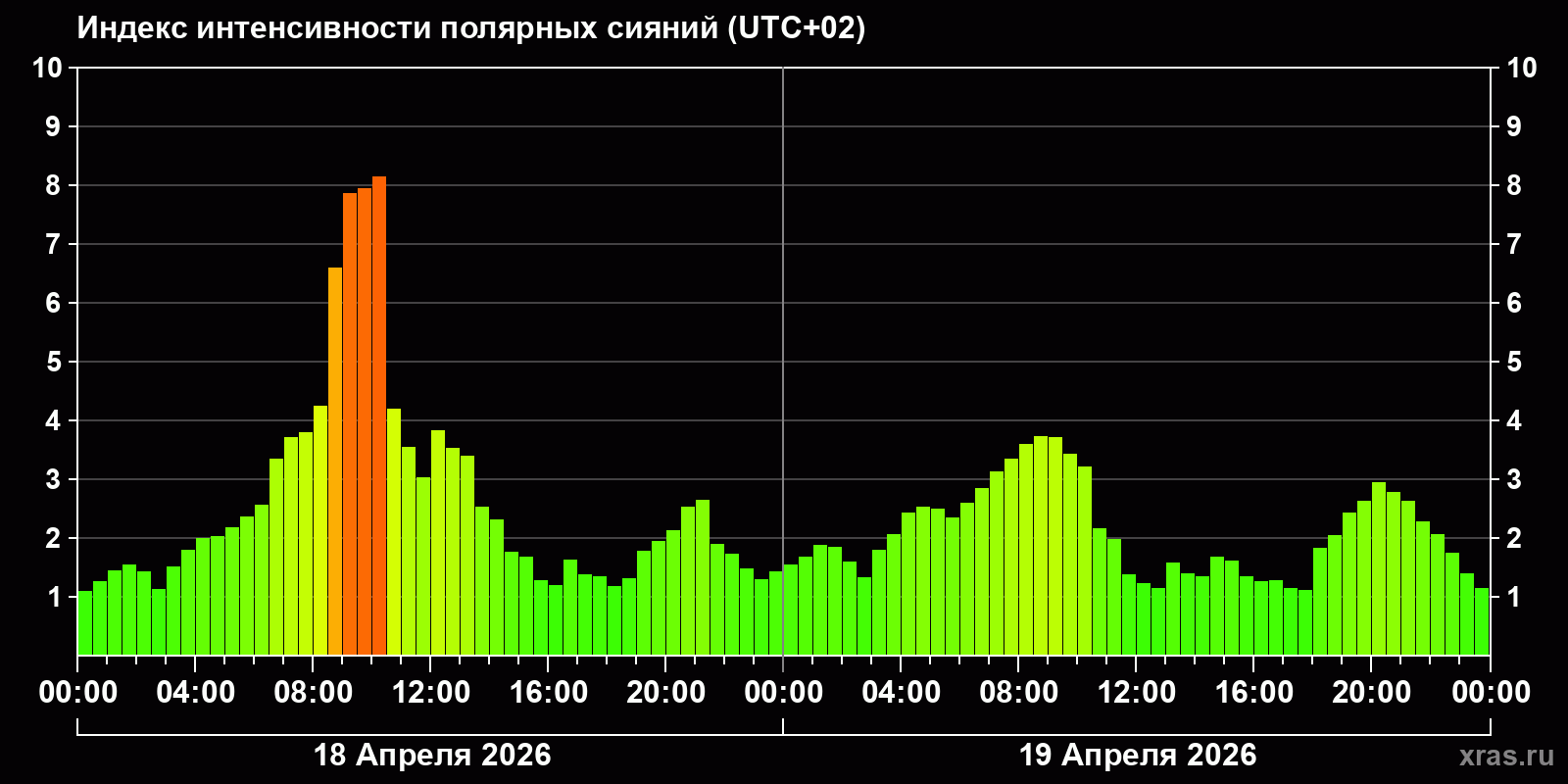 Изменения индекса интенсивности полярных сияний с 2026-04-18 по 2026-04-19 по местному времени