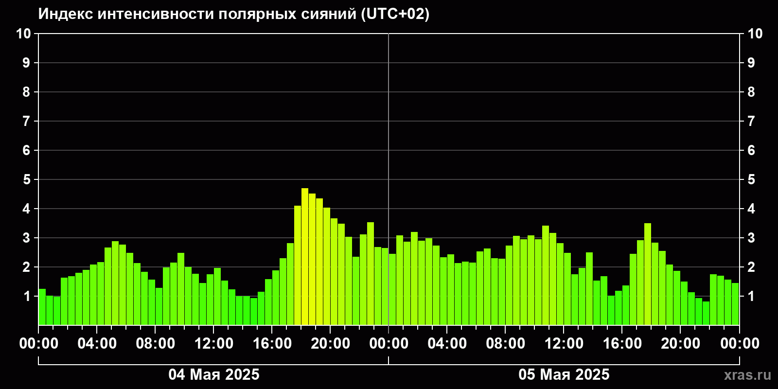 Изменения индекса интенсивности полярных сияний с 2025-05-04 по 2025-05-05 по местному времени