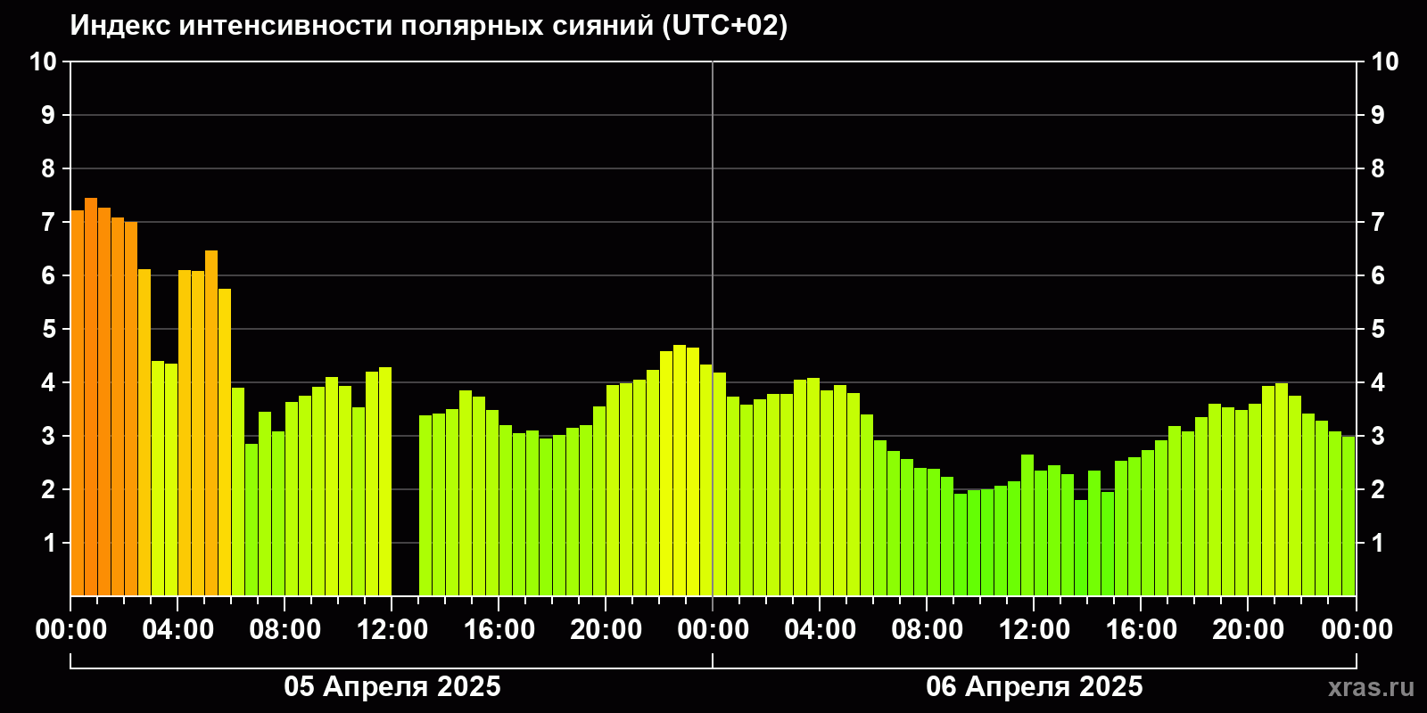 Изменения индекса интенсивности полярных сияний с 2025-04-05 по 2025-04-06 по местному времени