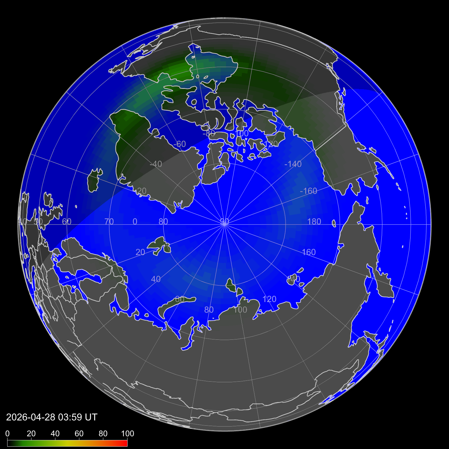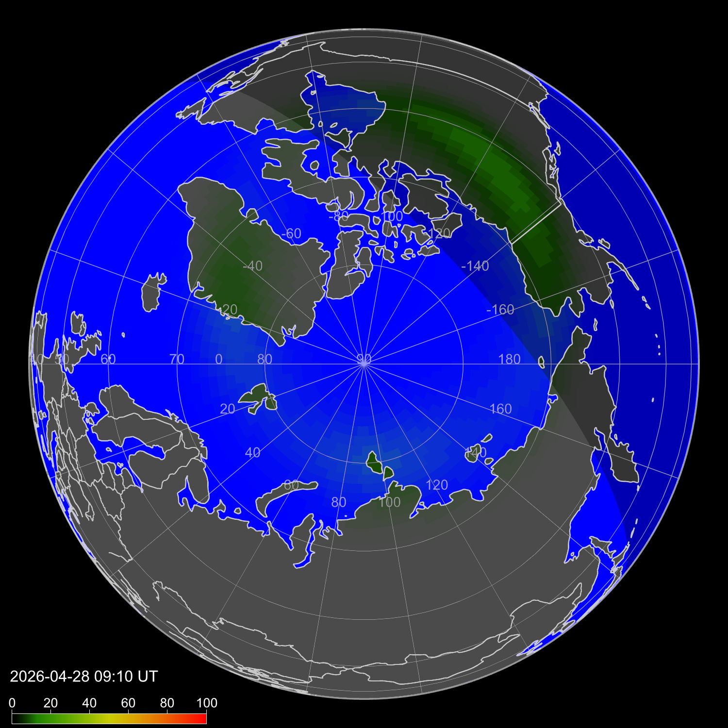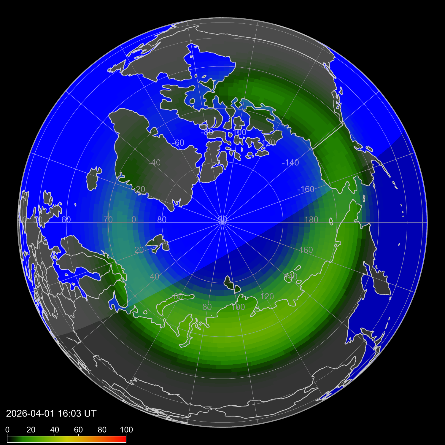 Индекс интенсивности полярных сияний и теоретически возможная широта наблюдений для ночного времени в западном полушарии