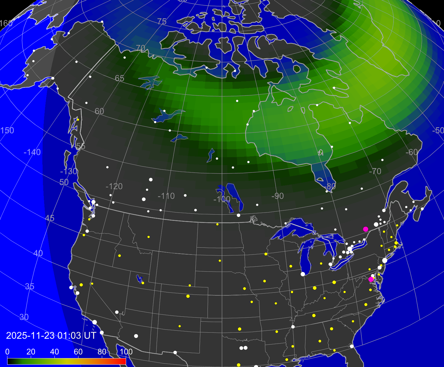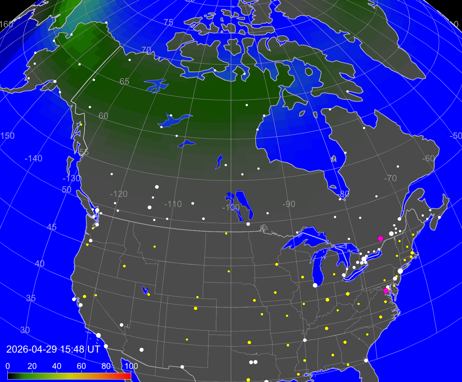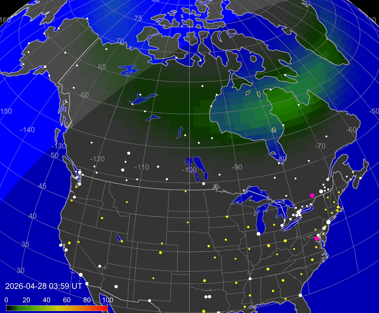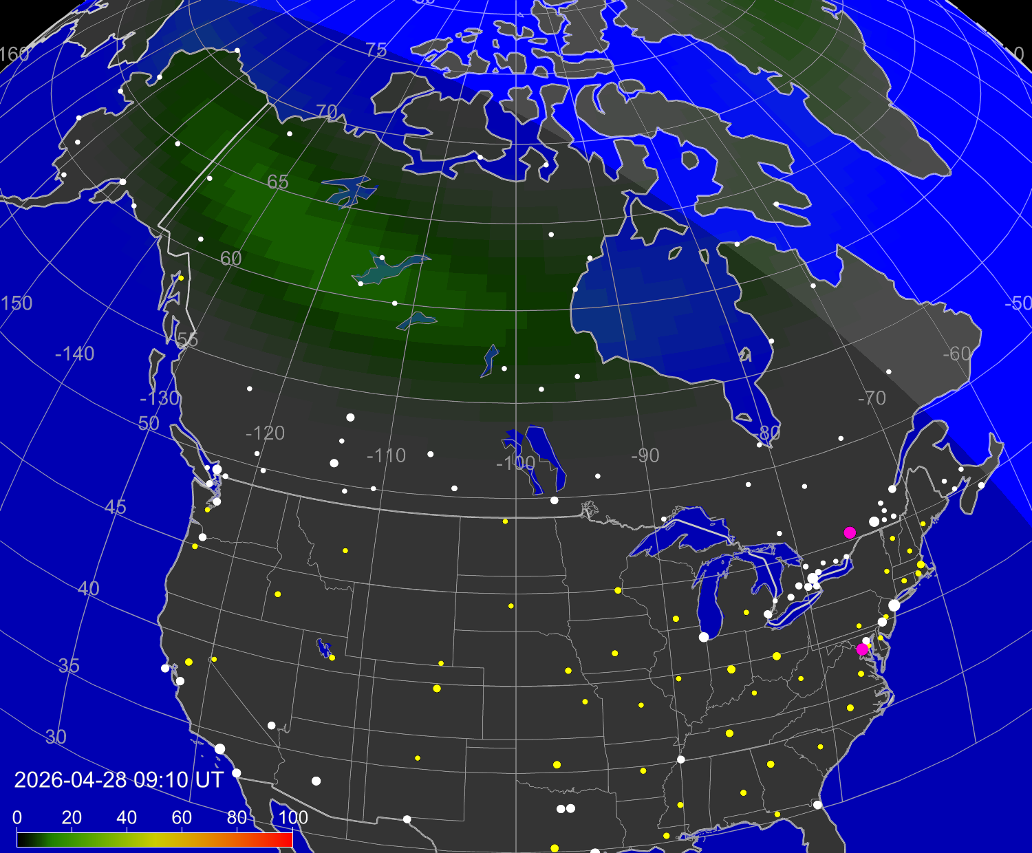 Индекс интенсивности полярных сияний и теоретически возможная широта наблюдений для ночного времени в западном полушарии