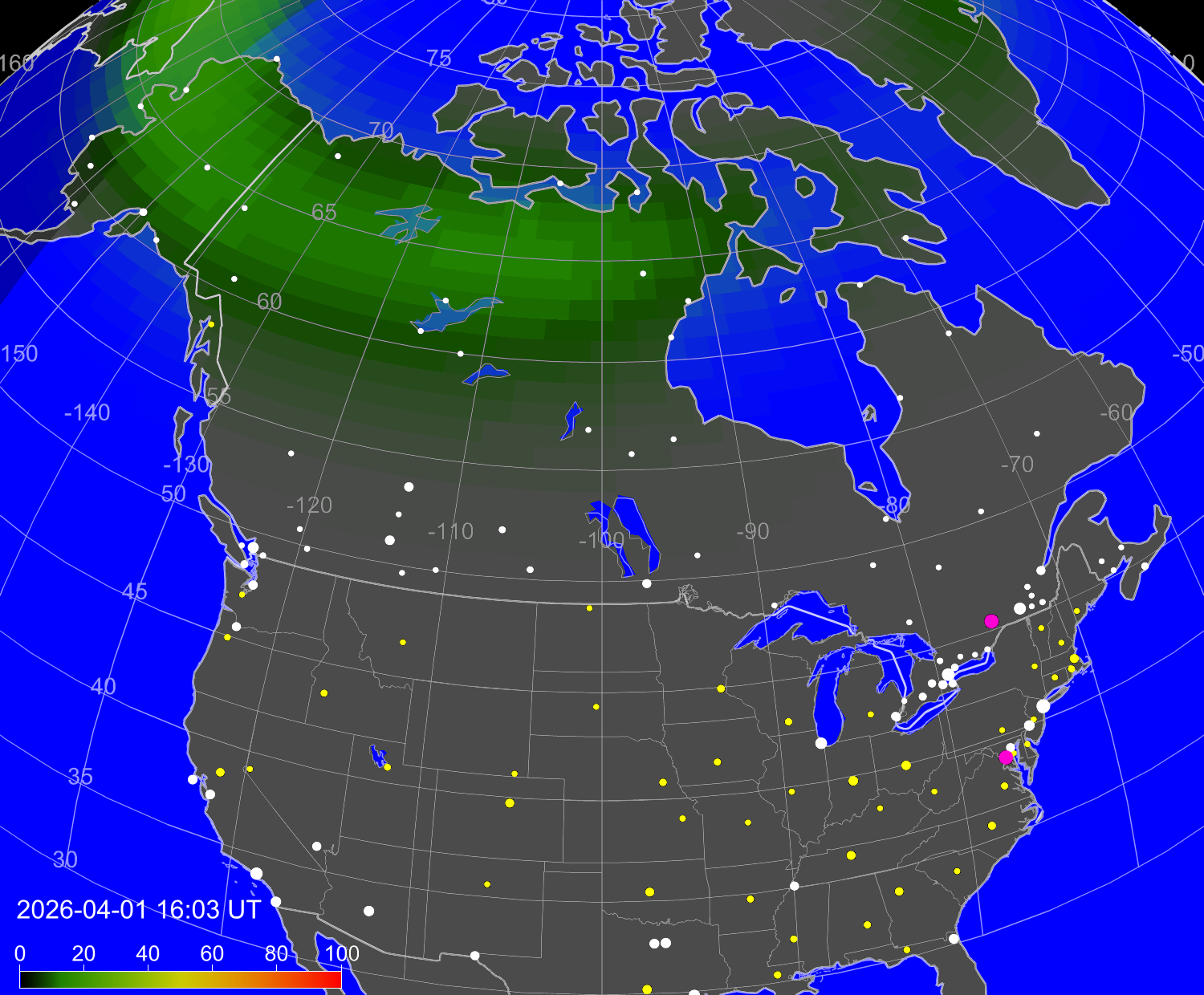 Вероятность полярных сияний в городах США
