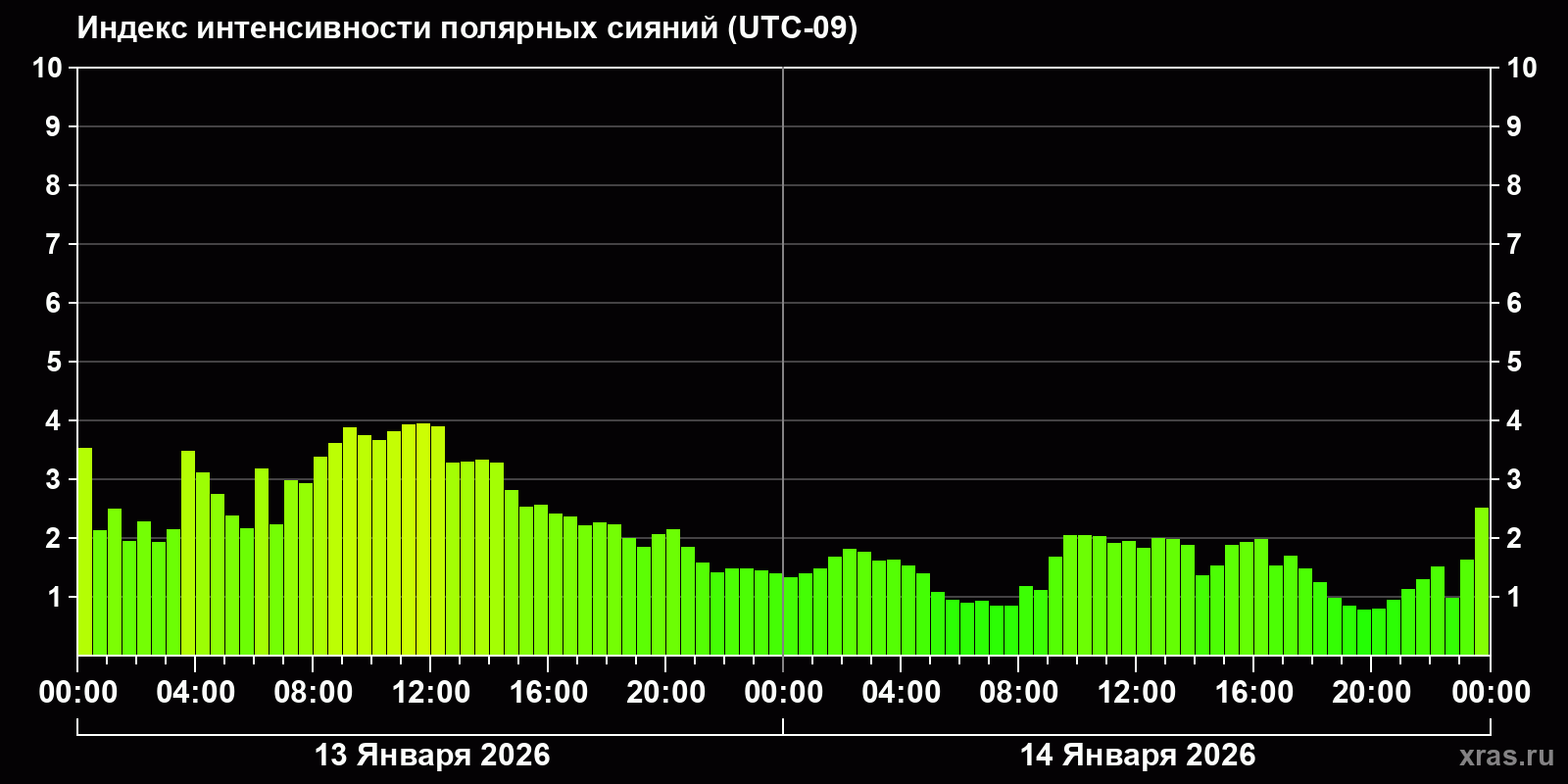 Изменения индекса интенсивности полярных сияний с 2026-01-13 по 2026-01-14 по местному времени