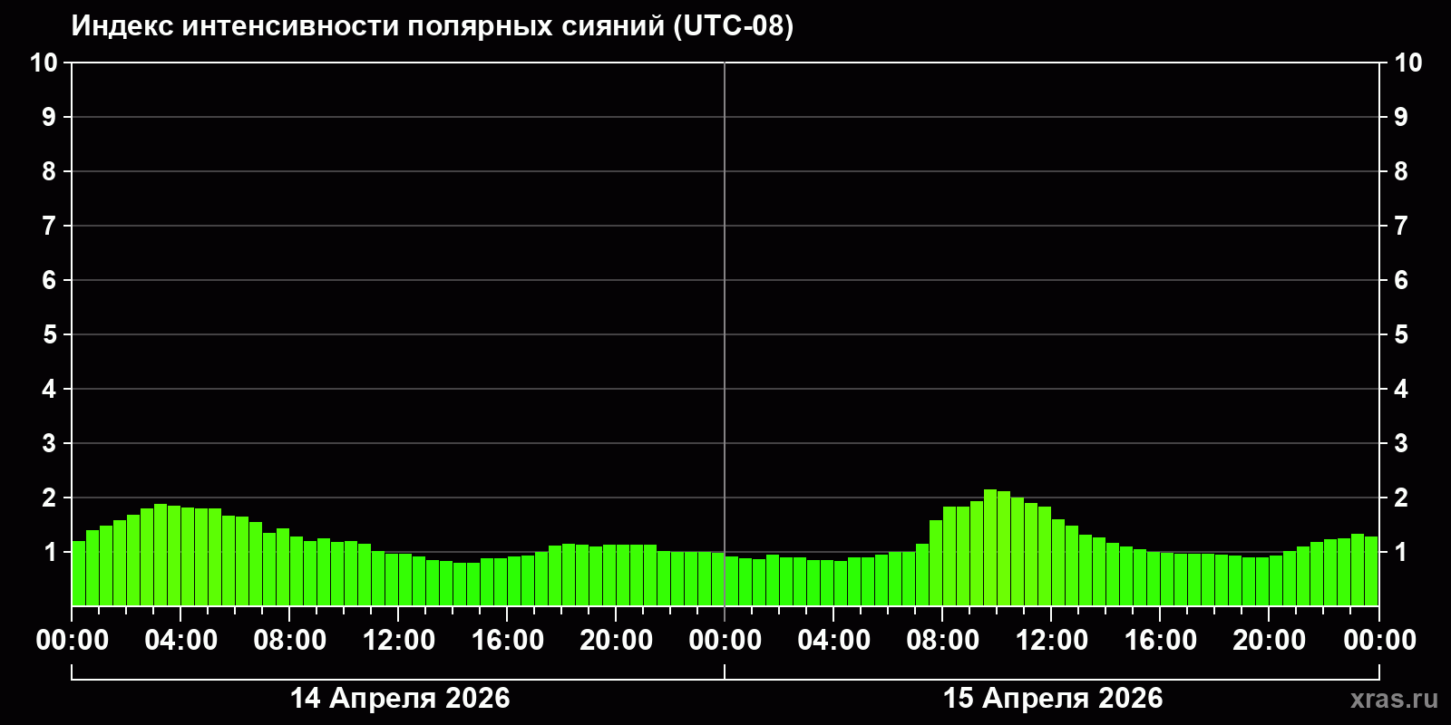 Изменения индекса интенсивности полярных сияний с 2026-04-14 по 2026-04-15 по местному времени