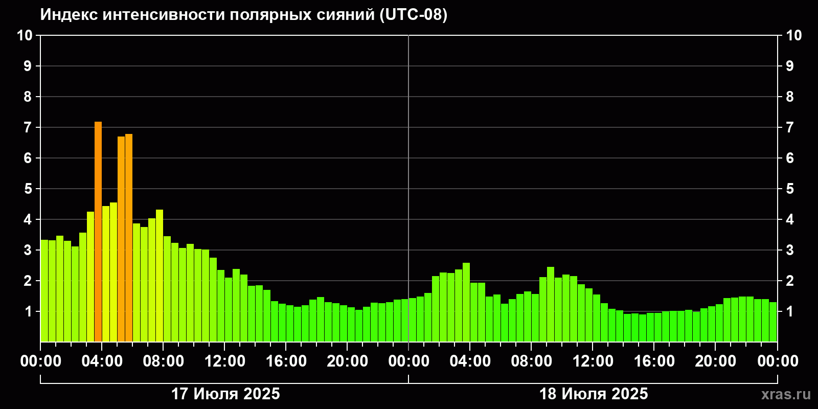 Изменения индекса интенсивности полярных сияний с 2025-07-17 по 2025-07-18 по местному времени