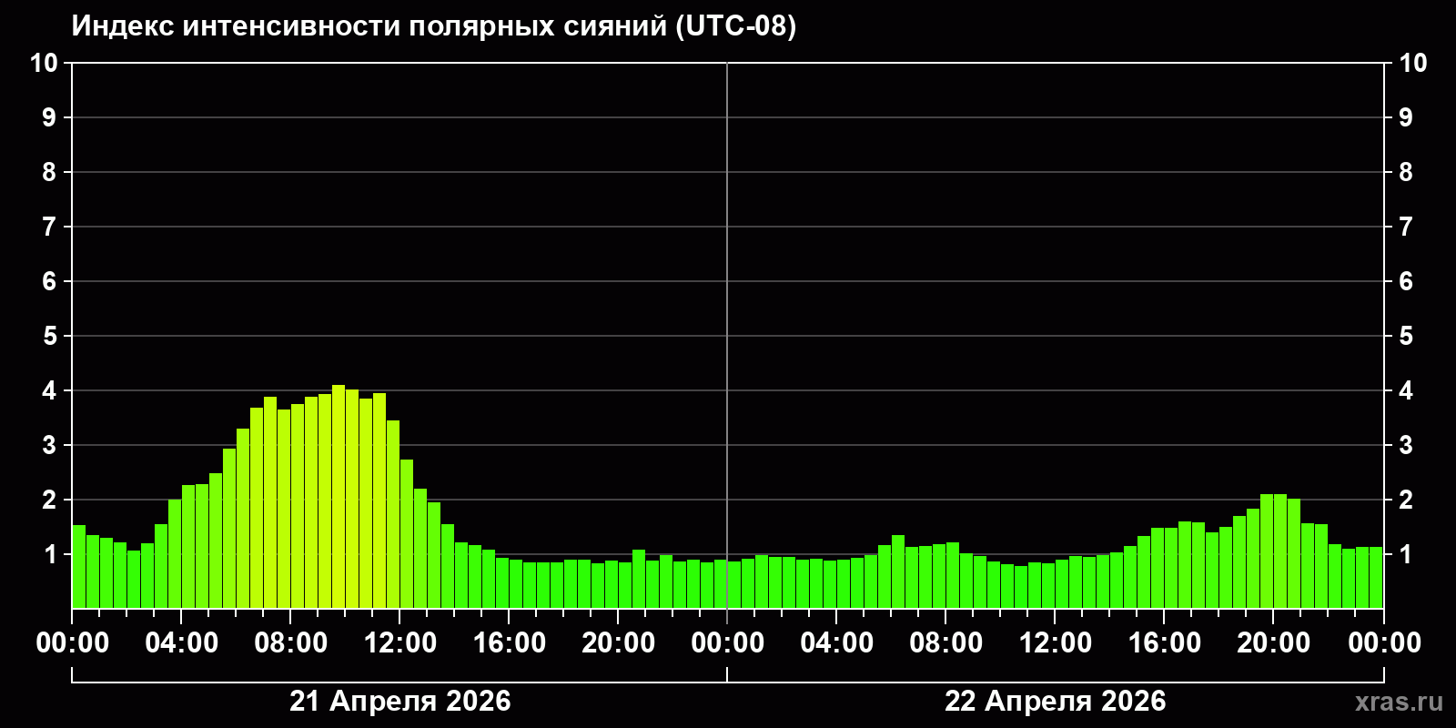 Изменения индекса интенсивности полярных сияний с 2026-04-21 по 2026-04-22 по местному времени