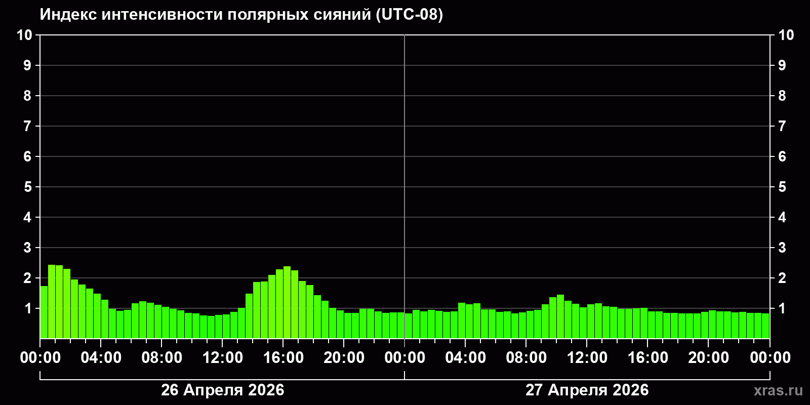 Изменения индекса интенсивности полярных сияний с 2026-04-26 по 2026-04-27 по местному времени