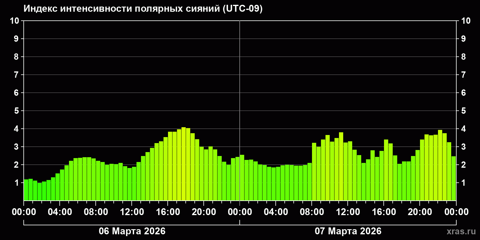 Изменения индекса интенсивности полярных сияний с 2026-03-06 по 2026-03-07 по местному времени