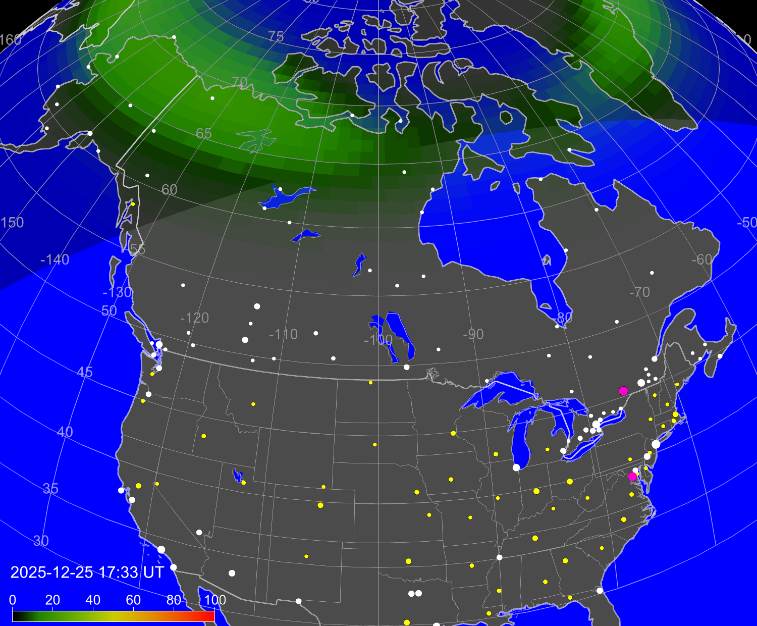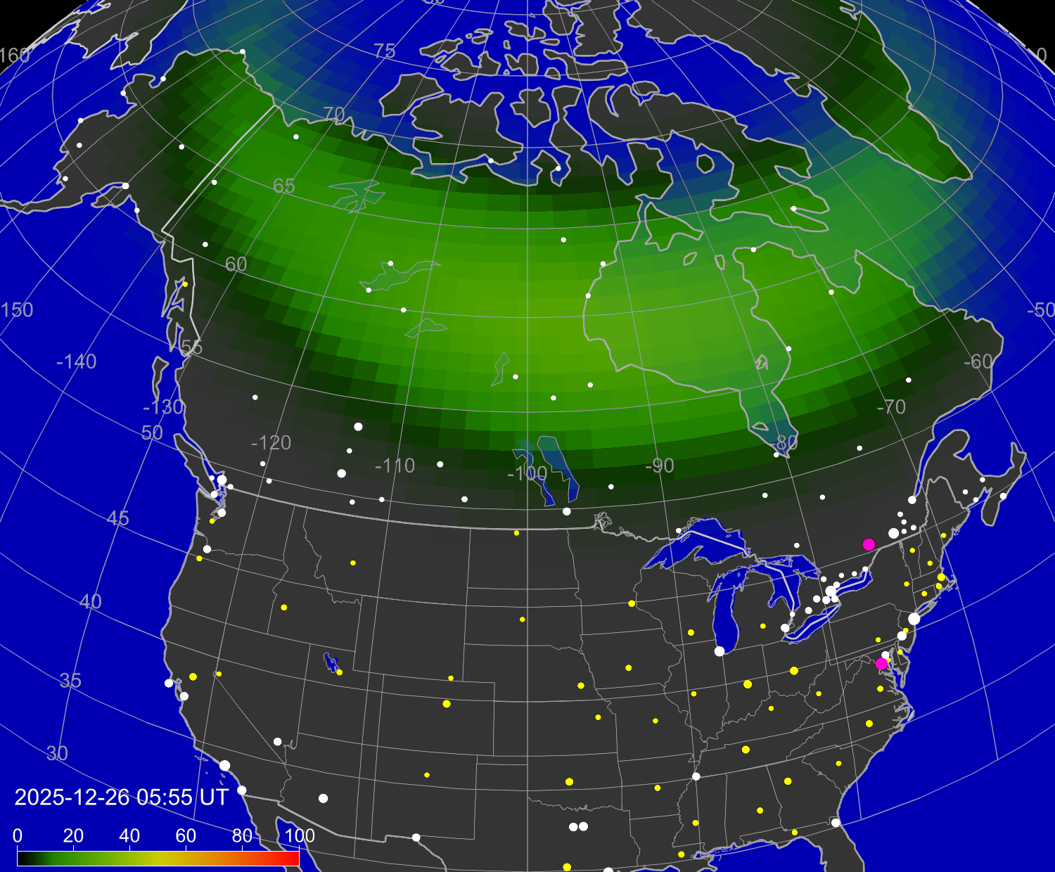 Изменения и часовой прогноз индекса интенсивности полярных сияний с 2025-12-23 по 2025-12-24
