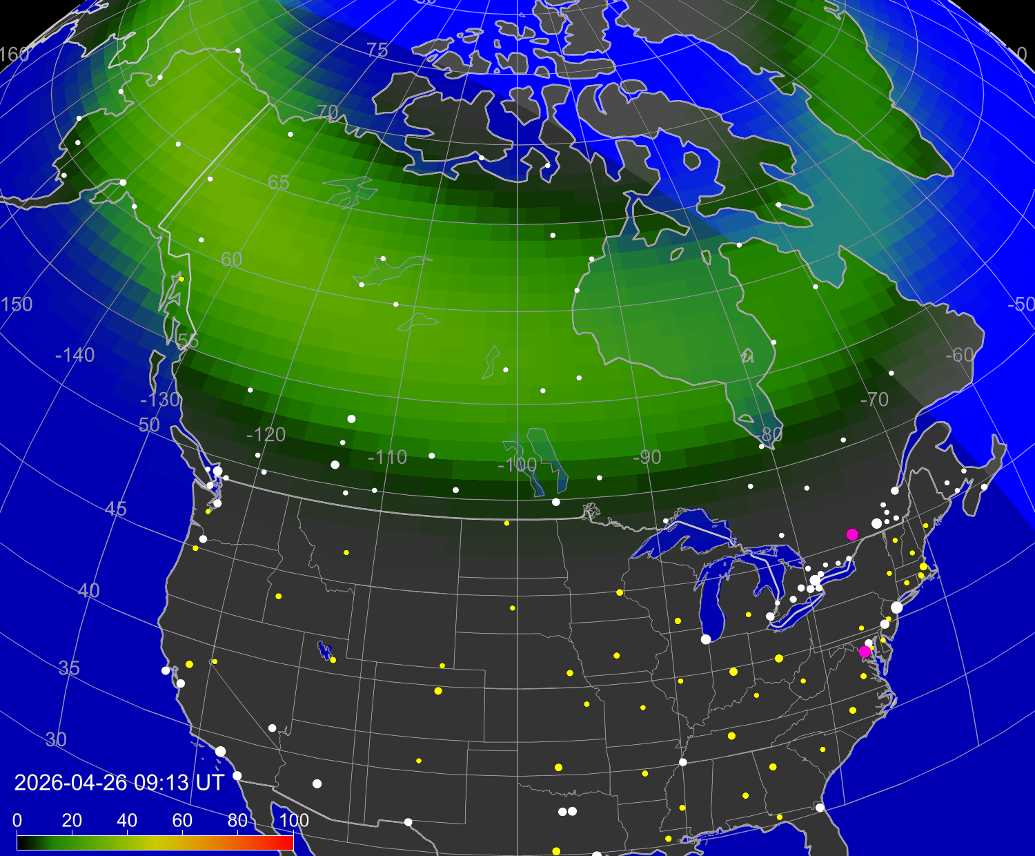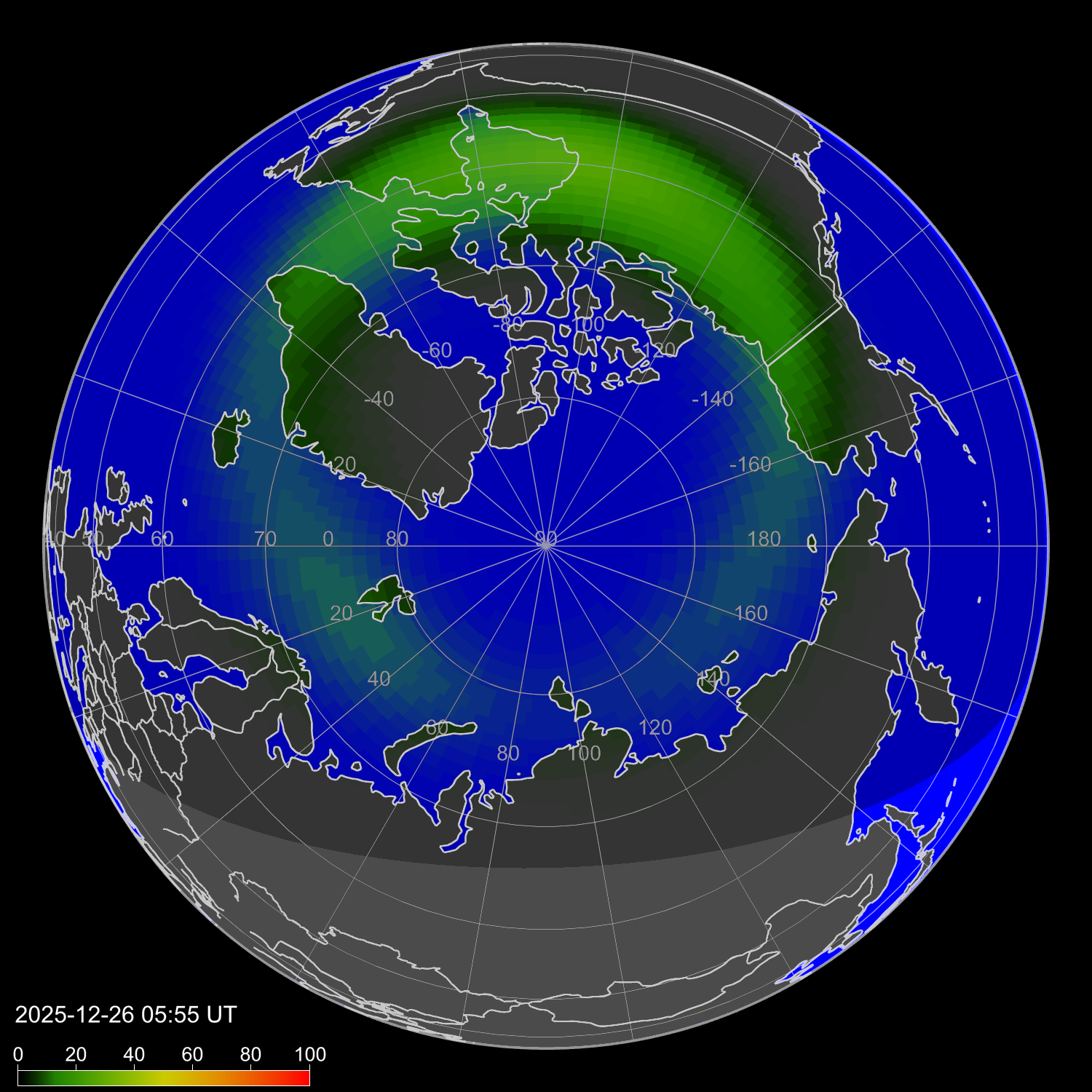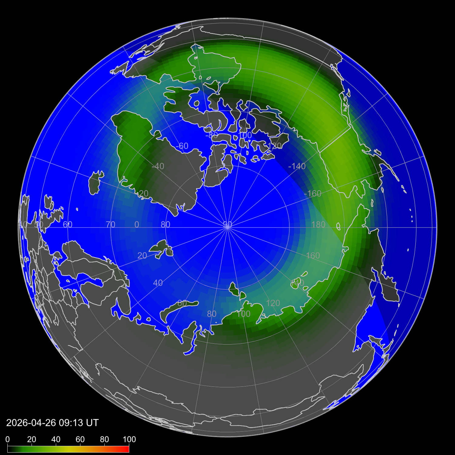 Индекс интенсивности полярных сияний и теоретически возможная широта наблюдений для ночного времени в западном полушарии