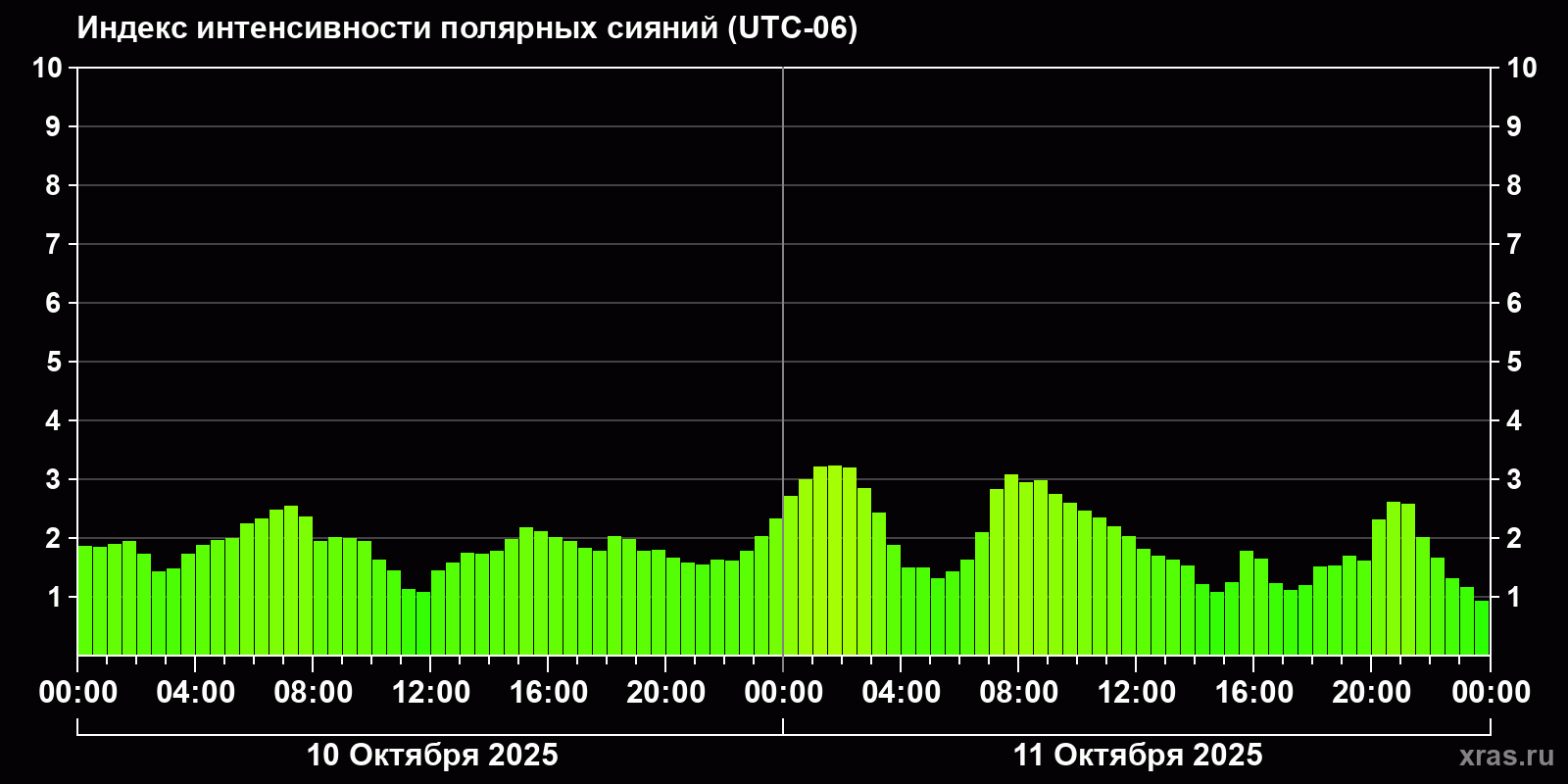 Изменения индекса интенсивности полярных сияний с 2025-10-10 по 2025-10-11 по местному времени