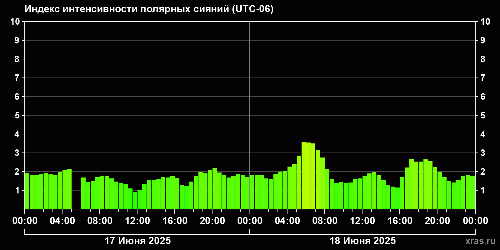 Изменения индекса интенсивности полярных сияний с 2025-06-17 по 2025-06-18 по местному времени