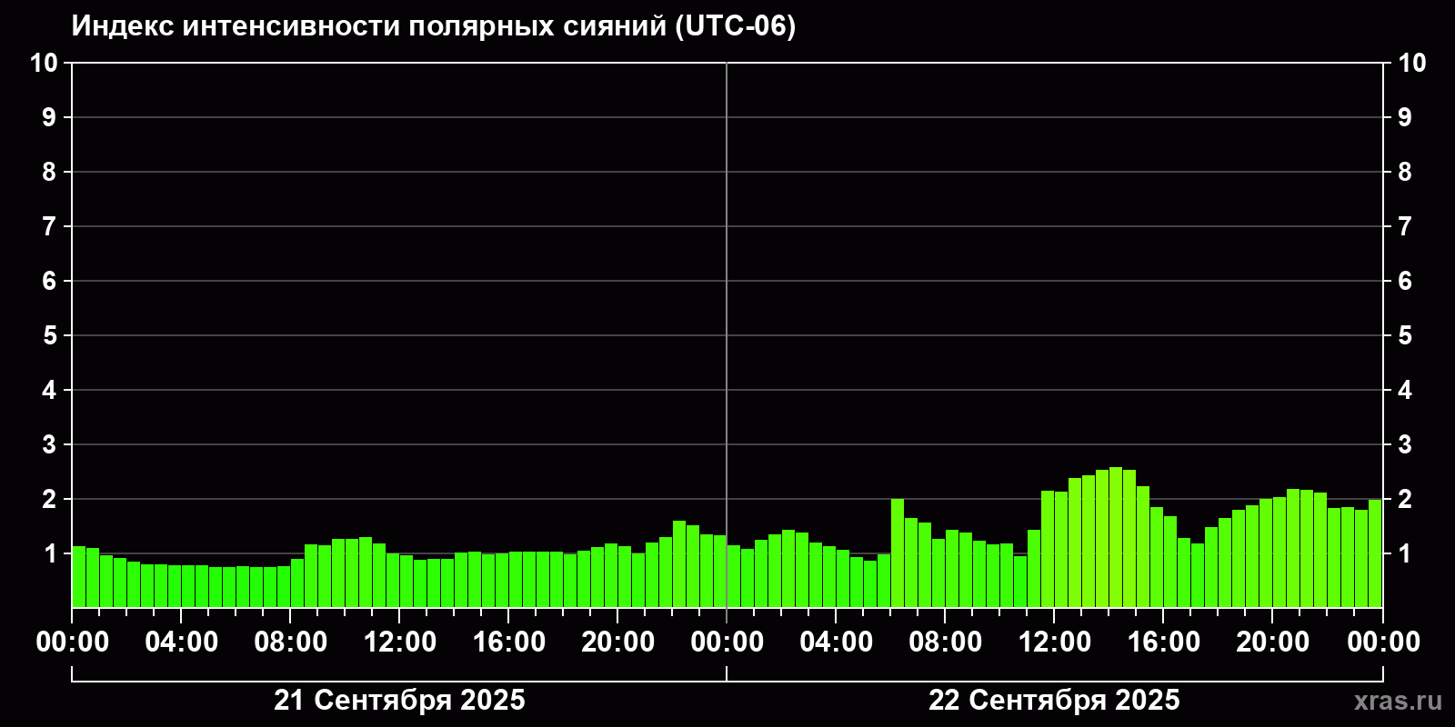 Изменения индекса интенсивности полярных сияний с 2025-09-21 по 2025-09-22 по местному времени