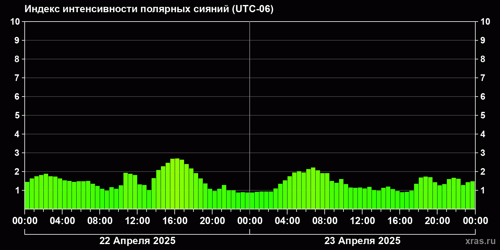 Изменения индекса интенсивности полярных сияний с 2025-04-22 по 2025-04-23 по местному времени